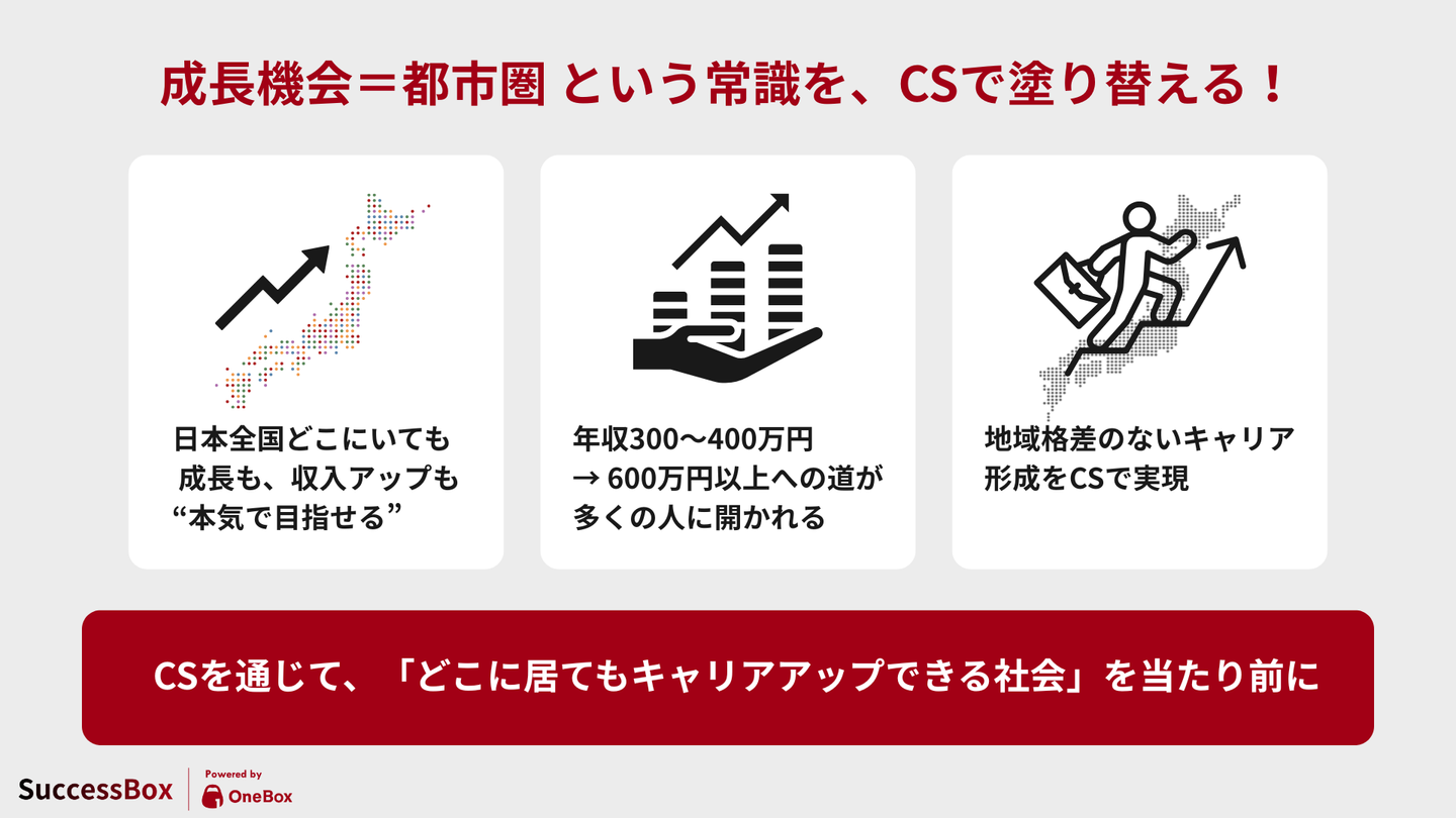 SuccessBoxが目指すのは、「日本全国どこで生活をしていても、キャリアの選択肢が広がり、収入が増えるという世界を当たり前にしていく」という未来です。