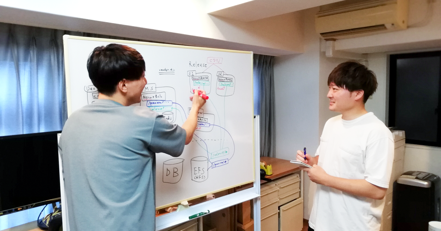 鈴木:業務上の課題を質問しやすいことです。自ら模索することも大切ですが、どうしても難しい時には、上司が一緒に考えたり手を動かしながら教えてくれるので、とてもありがたいです。特に普段いいなと思ってるのは、ホワイトボードに書いて教えてくれること。 エンジニアなので、例えばデータベースやインフラのことなど、口頭の説明だけではイメージしづらいことがどうしてもあって。そんな時、図解してもらうことで理解が進むので、本当に助かっています。