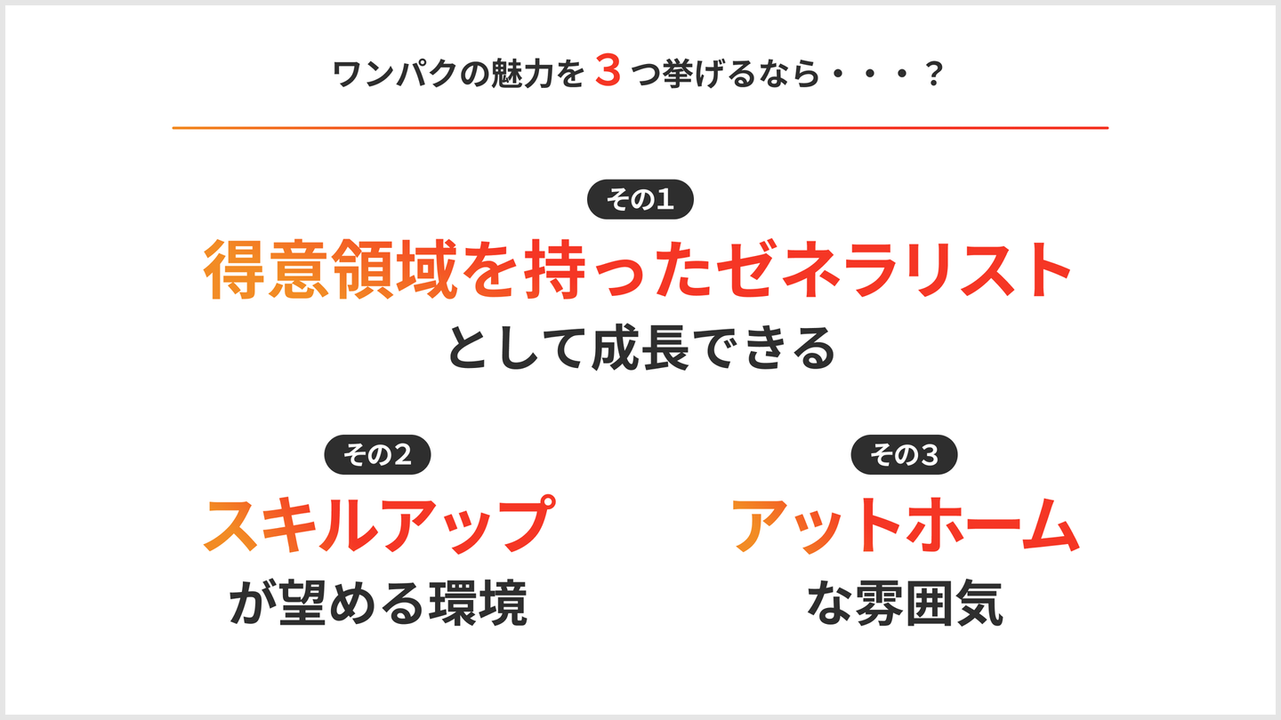 「大規模で多種多様なプロジェクトに参加できる」「プロジェクトの上流工程に携われる」「意見を言いやすい関係性」など、たくさんのワンパクの魅力を挙げてくれた3人ですが、その中でも特にここが良い!という3つの魅力について、深堀りして話を聞きました。