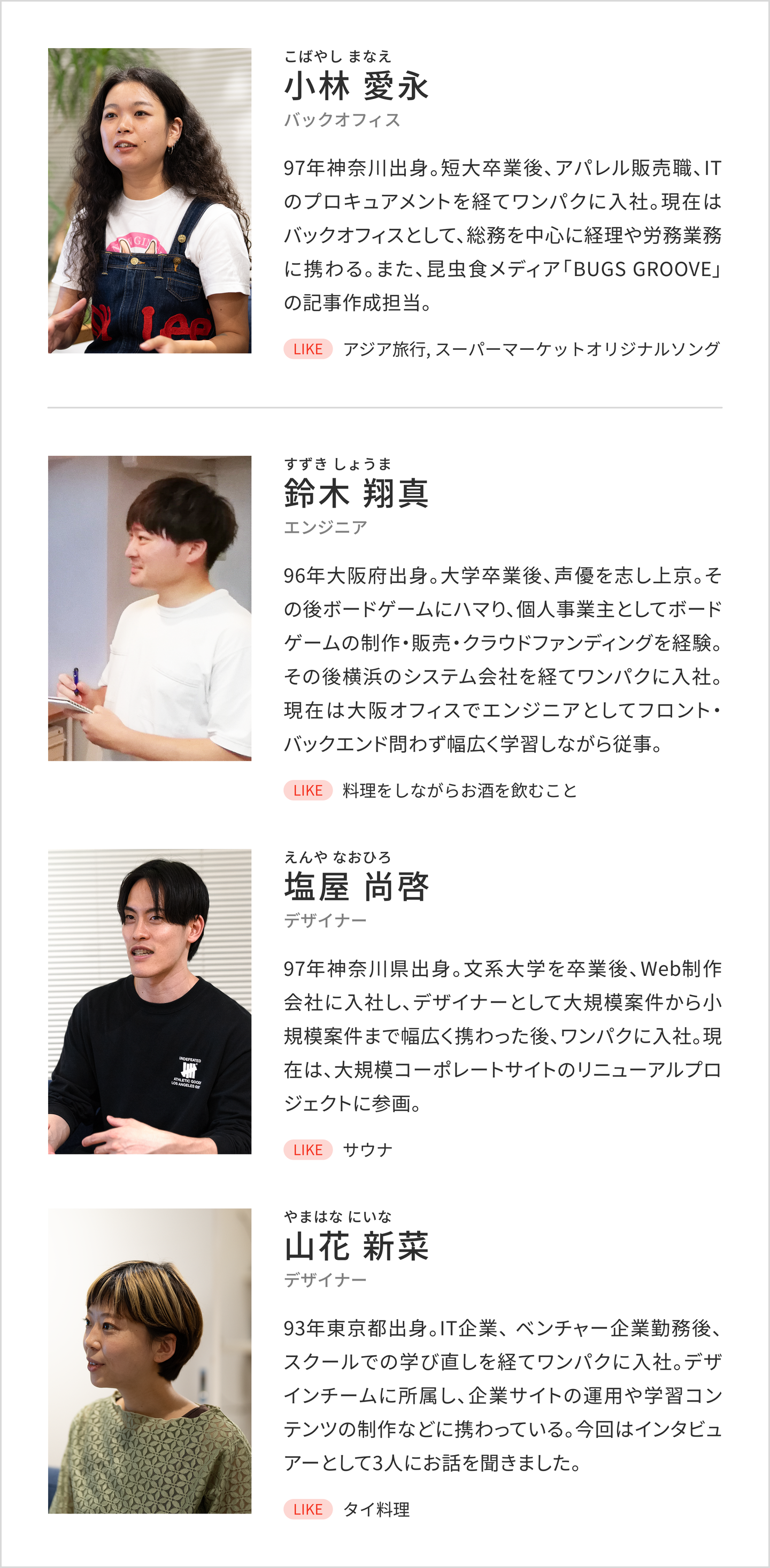 そんなワンパク社内の様子をお伝えするため、今回は20代で社歴もフレッシュな小林、鈴木、塩屋に、デザイナーの山花がそれぞれが感じる「ワンパクの魅力」についてインタビューしました!
