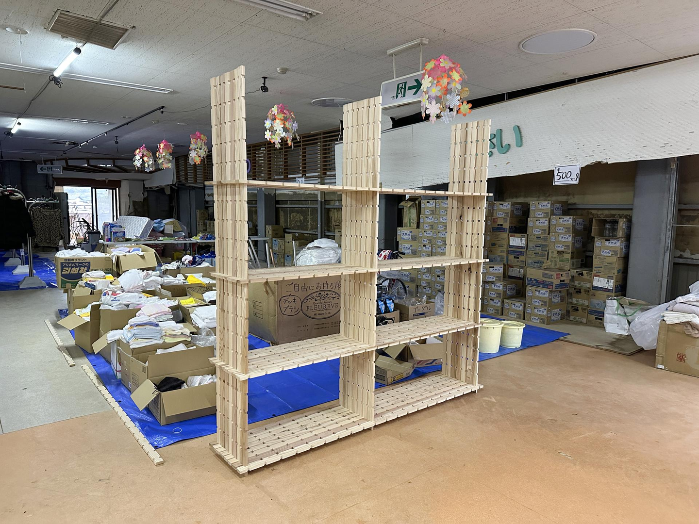 そこで、物資を整理・収納するために、釘やネジを使わずに組み立てられる「組手什(クデジュウ)」を使って棚を作成しました。