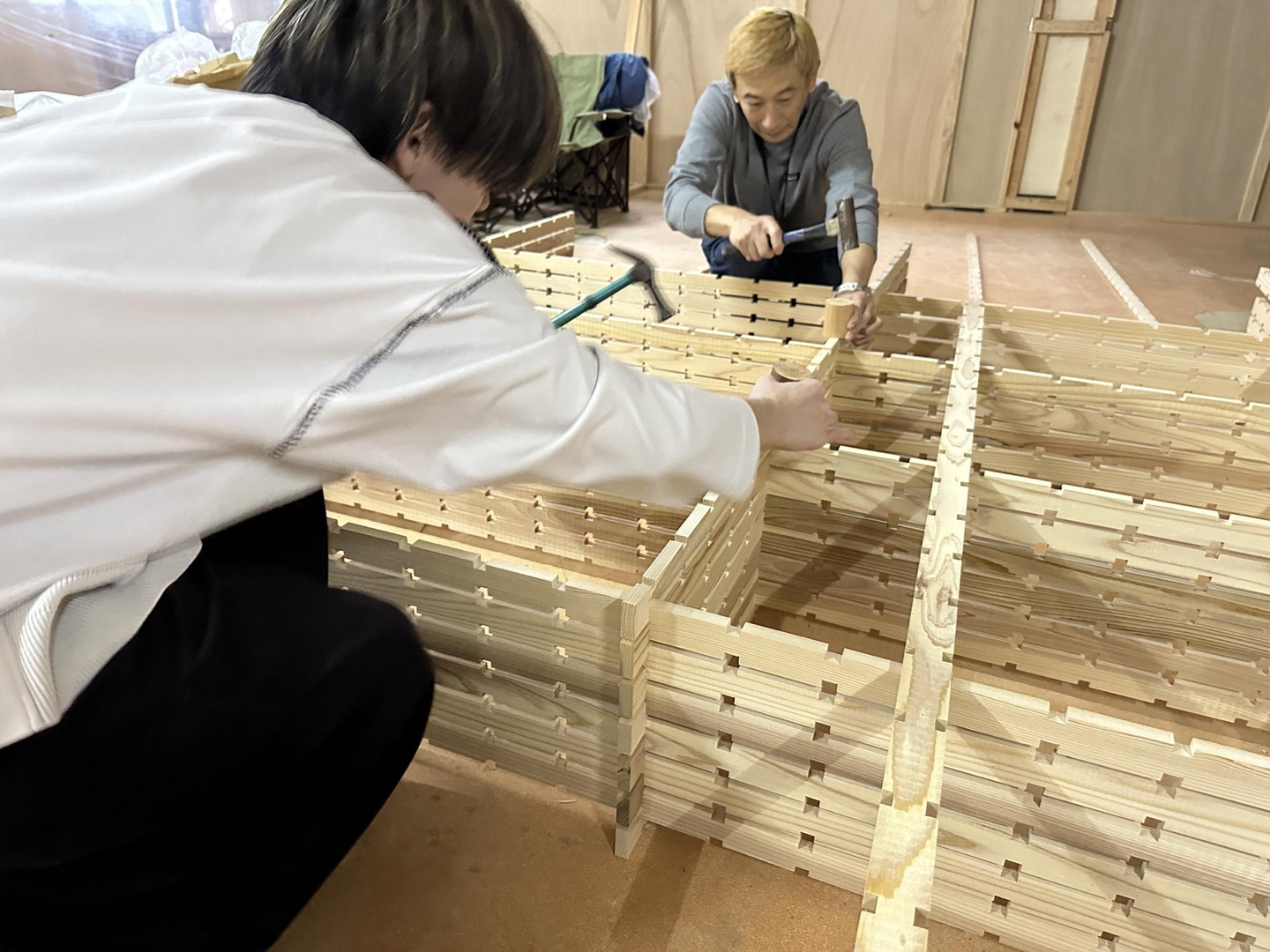 組み立て作業は初めての挑戦で、パーツ同士の差し込みがうまくいかず苦労する場面もありましたが、現役の大工さんの丁寧な指導のおかげで、スムーズに作業を進めることができました。