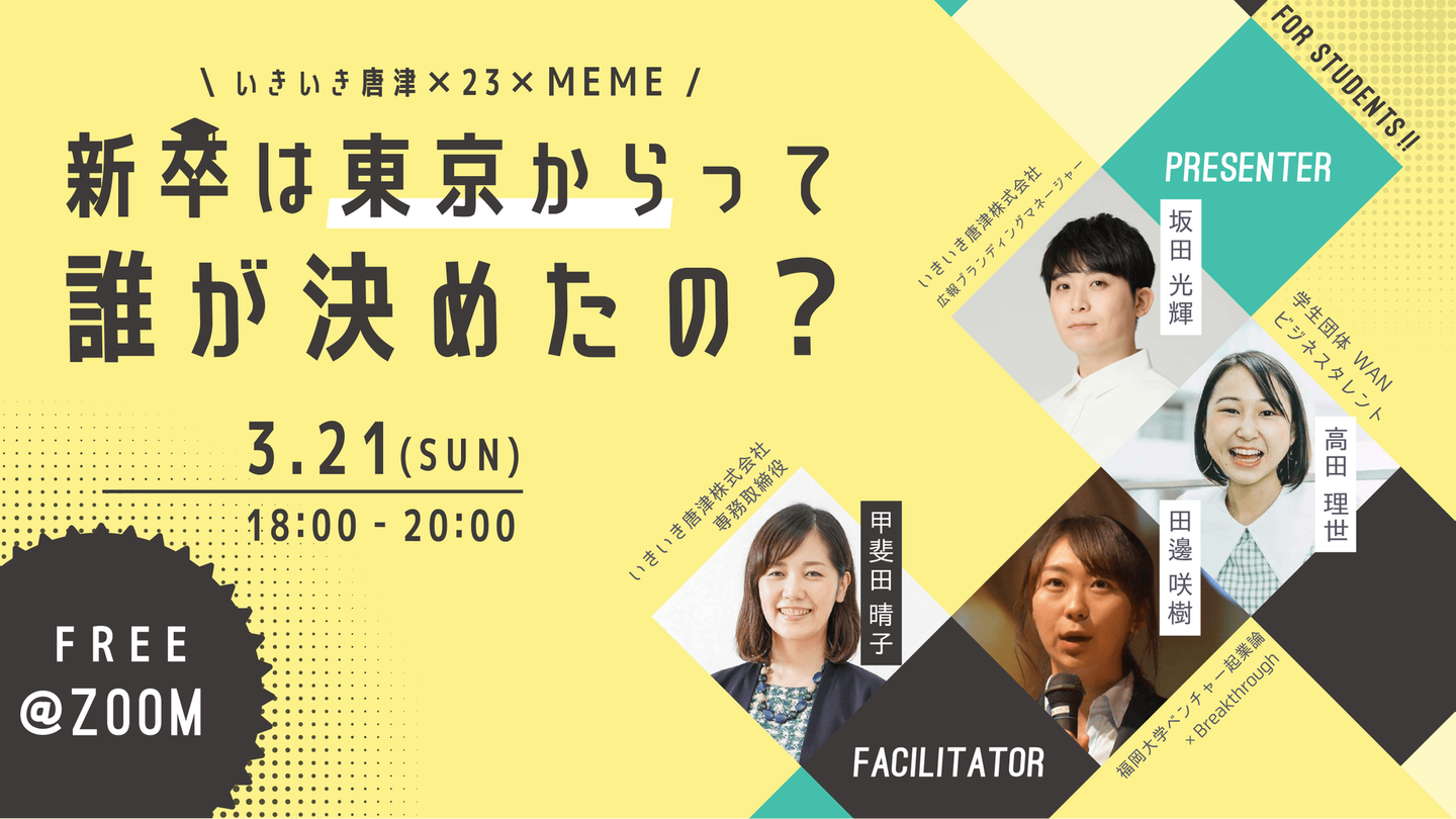 佐賀県唐津市のまちづくりに注力するいきいき唐津株式会社とオンラインイベント「新卒は東京からって誰が決めたの?」を共催。企画から当日のイベント運営まで担当しました。