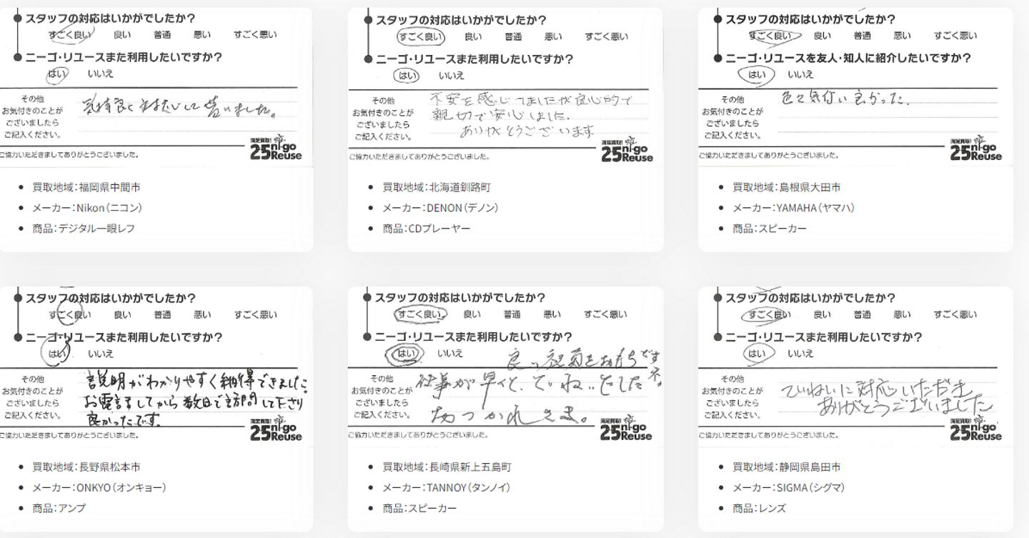 当社では成約時にお客様アンケートを実施し、実際に利用してみての生の声を収集しています。回答いただいたアンケート内容はスタッフ全員で確認し、日々業務改善を行っています。また、お客様に回答いただいた口コミはどんな評価もホームページに掲載させていただいているので、より信頼度の高い口コミとなっていると思います。