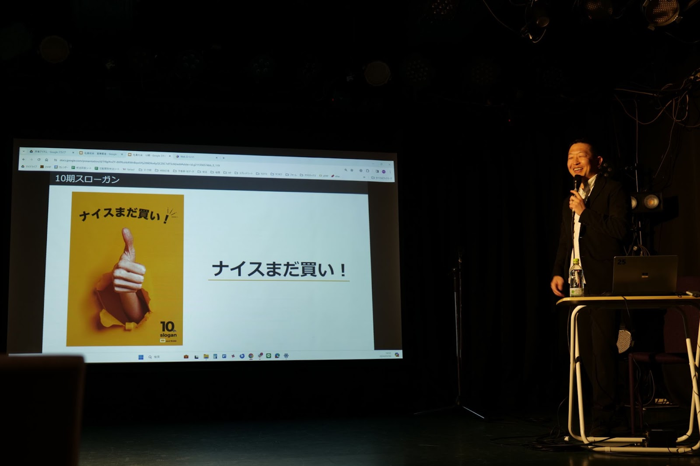 いきなり現れた大きなグッドサインの右手と、全く予想していなかった全社スローガンに会場が驚きに包まれました。