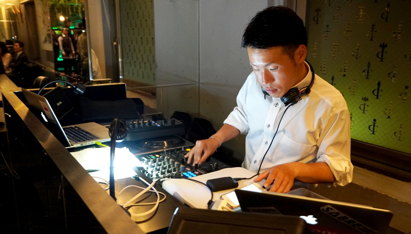 ※DJブースでミキサーを操作する友基。表情は真剣そのもの!! 決起会は三浦代表がDJを担当することがほとんどですが、こんな風に友基が立つこともたまにあります。