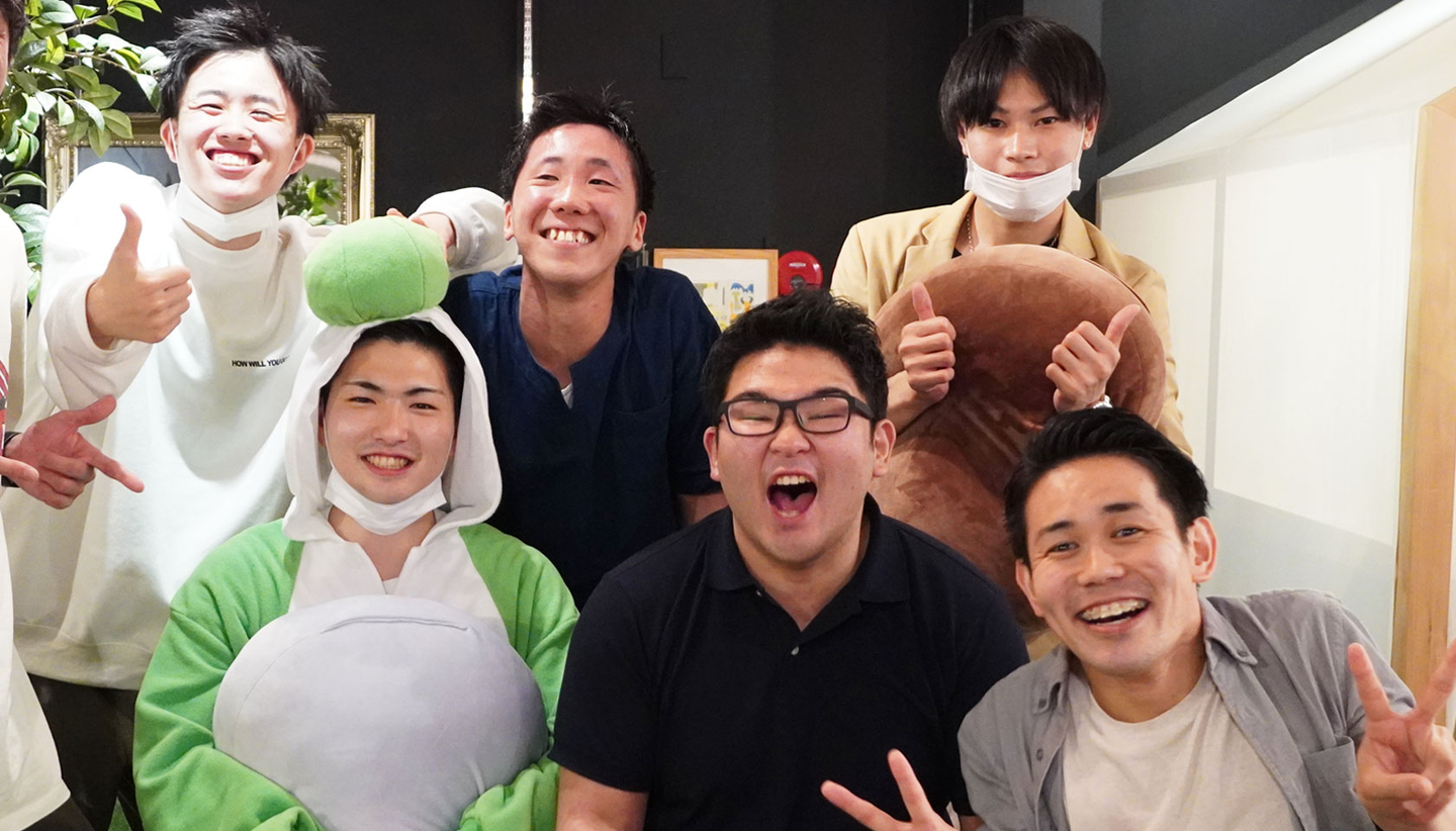 ※4月入社メンバー、ヨッシーの着ぐるみを着ているのは彼らの新人研修を担当している雄太です。