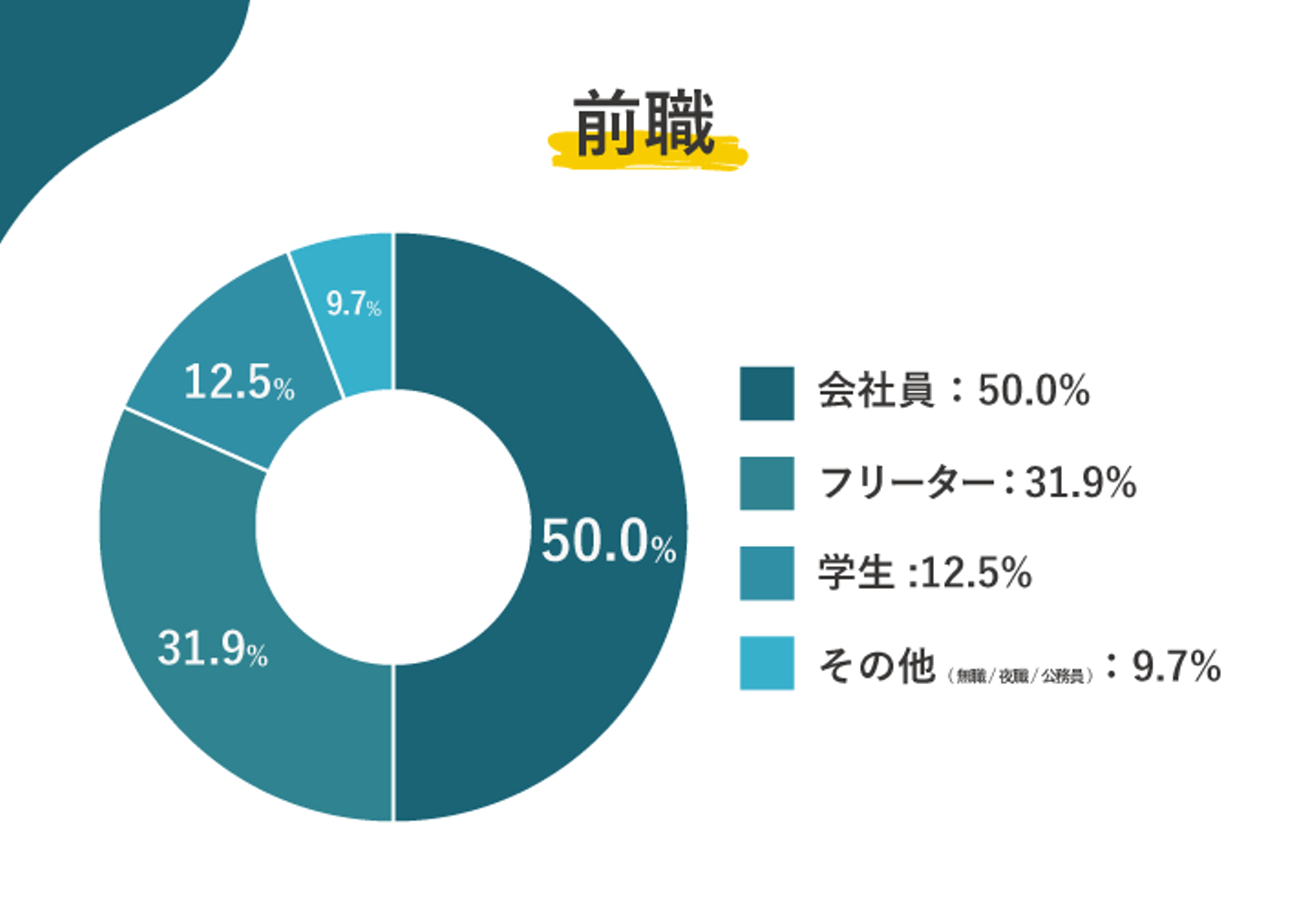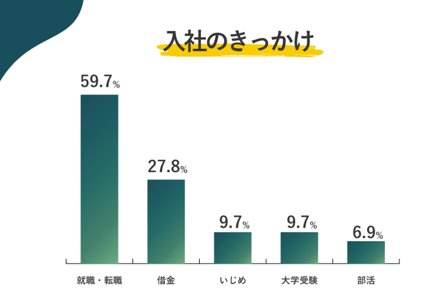 なんと50%と半数の人が会社員として働いていました。その次に多いのはフリーター(バイトや派遣)で31.9%、そして学生の12.5%となっています。「え! 働いていたのに、何でインターンシップに?」 と思う方もいますよね。もちろん入社の理由も聞いてきましたよ。