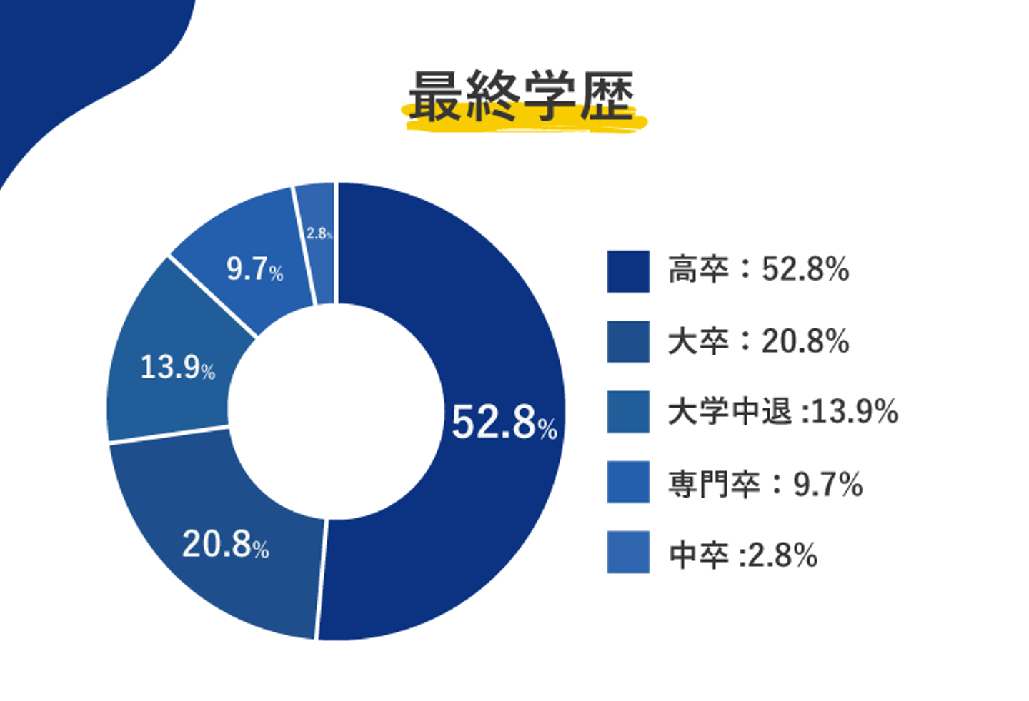 昨年よりも高卒が10%も増え52.8%、その次に多いのは大卒で20.8%、そして大学中退、専門学校、中卒という順になりました。