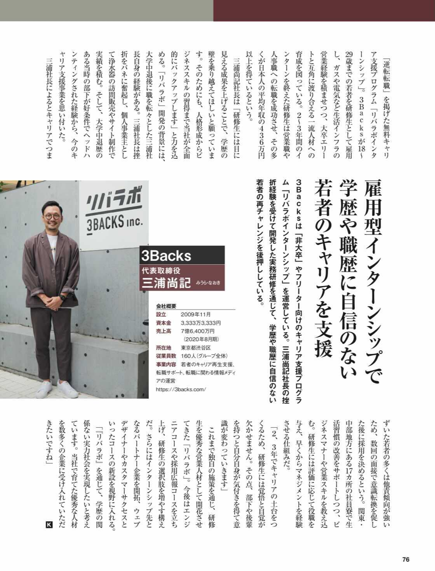 3Backsは「非大卒」やフリーター向けのキャリア支援プログラム「リバラボインターンシップ」を運営している。三浦尚記社長の挫折経験を受けて開発した実務研修を通じて、学歴や職歴に自信のない若者の再チャレンジを後押ししている。