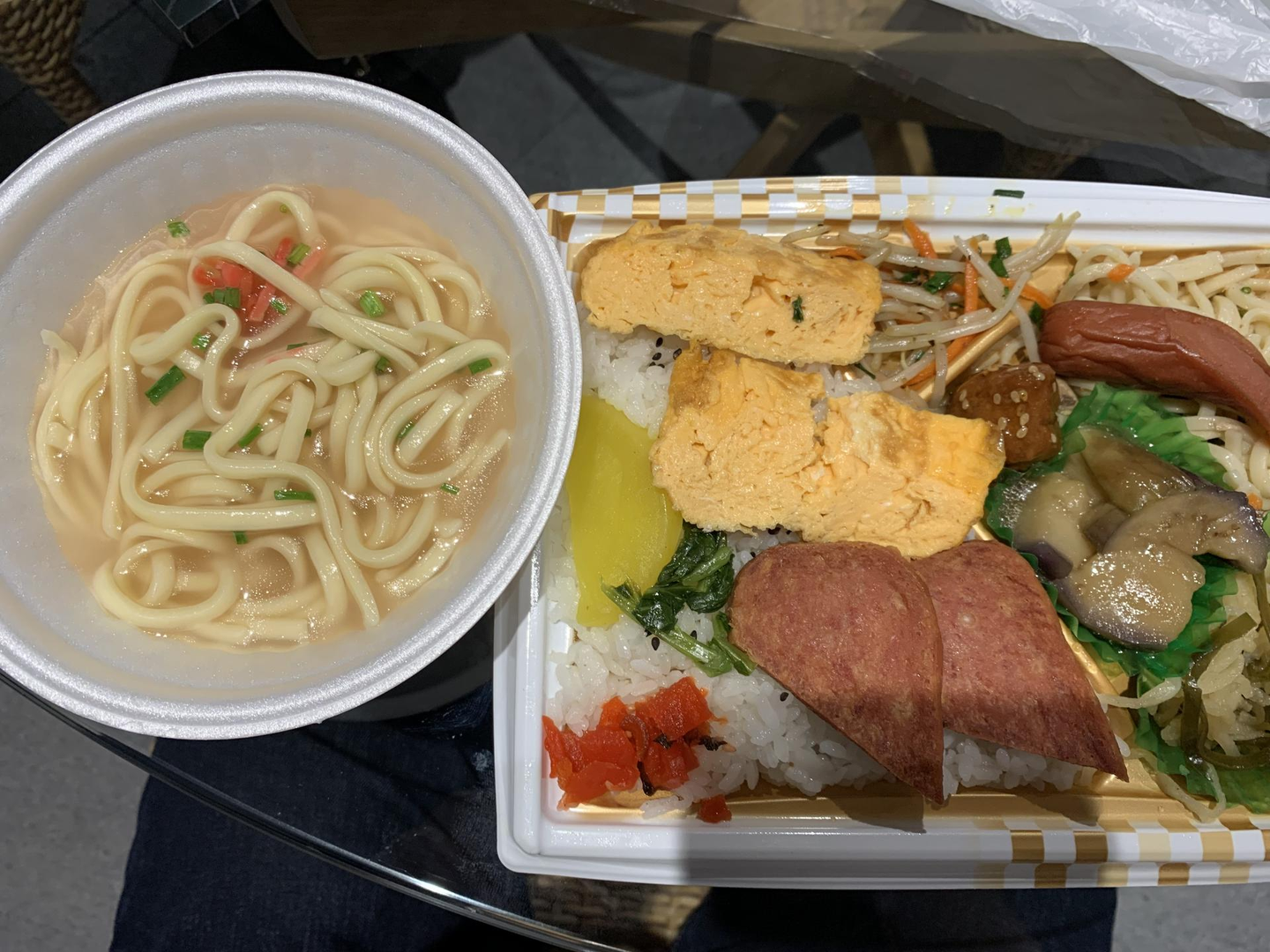 東京に住んでいると信じられないくらいのお値段なのですが、ポーク卵弁当が380円(くらいだったかと思う)、そして左の味噌汁代わりに買ったミニ沖縄そばがなんと100円。100円ですよ、100円!!合計で500円でおつりが来るという状態。
