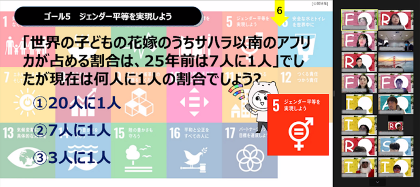 2つ目の「SDGsクイズ」。今年度から発足したSDGs推進事務局のメンバーが17ゴールに紐づくクイズを作成してくれました。みんな真剣に回答中。