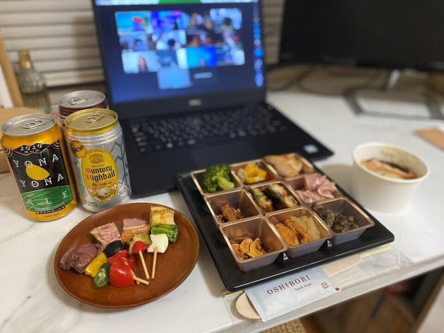 nonpiというフードデリバリーサービスのご飯と飲み物が各自の自宅に届きました!オンラインでもみんなで同じご飯が食べられるのは、なんだか嬉しい。