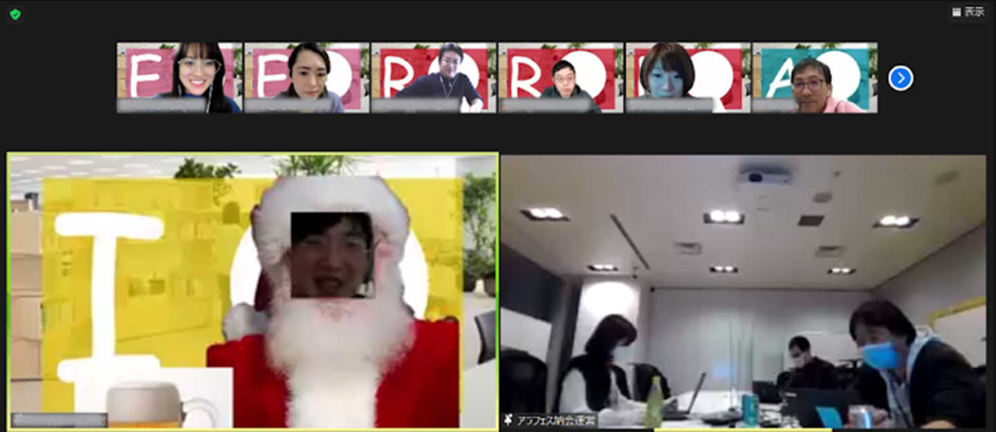 今年度入社した新卒社員の一人がサンタコスプレを背景画像に埋め込む、なんとも手の込んだものを作っていました。画像では分からないですが、実際に画面で見ると本人の顔がブレブレに動きまくって、小気味悪さに爆笑しました。