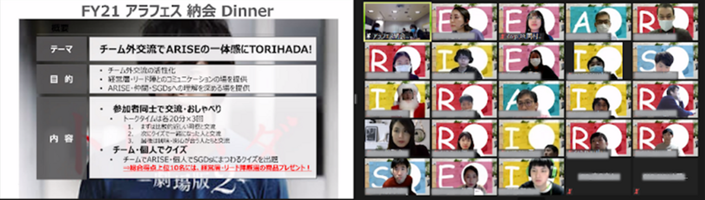 ARISE analyticsでは毎年年末に、従業員同士が一年の頑張りを労いあい、お酒とご飯を楽しみながら親睦を深める「アラフェス」という納会を開催しており、今年度は新卒2年目の社員が実行委員となって企画や当日の運営を行ってくれました🎉今回はオンラインにも関わらず約100名近くが参加し、大いなる盛り上がりを見せた、そんな「アラフェス」の様子をご紹介します!