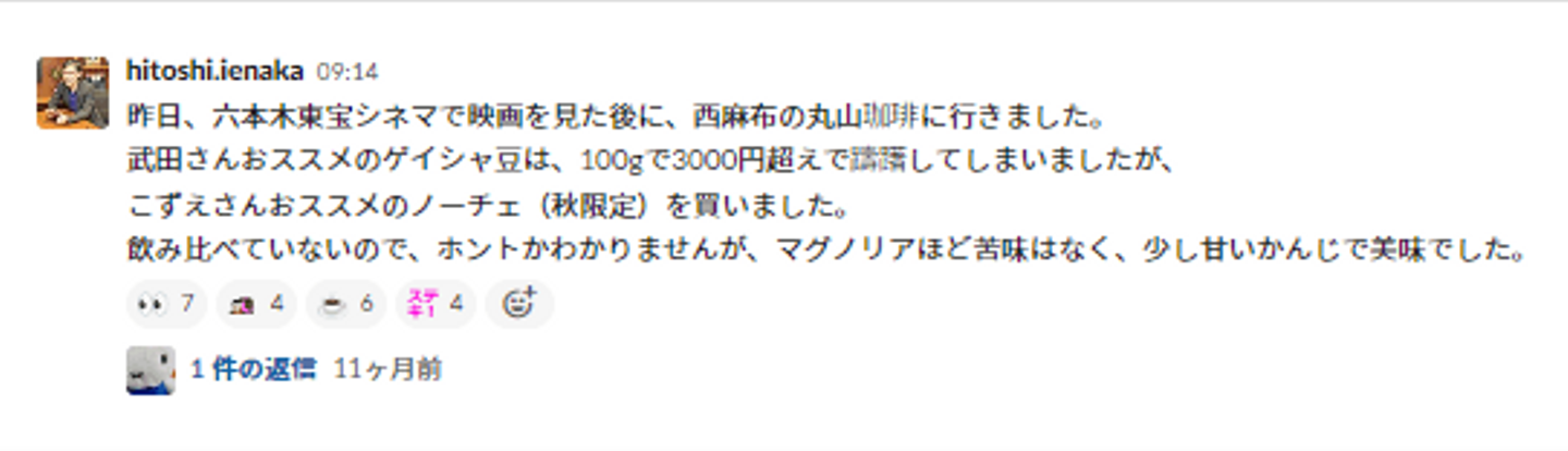 ARISE analyticsのslackには #cross-coffee チャンネルがあり、コーヒー好きな社員同士が情報交換や交流する場となっています。このチャンネルには経営陣も数多く参加しており、社長の家中もたまに呟いています。