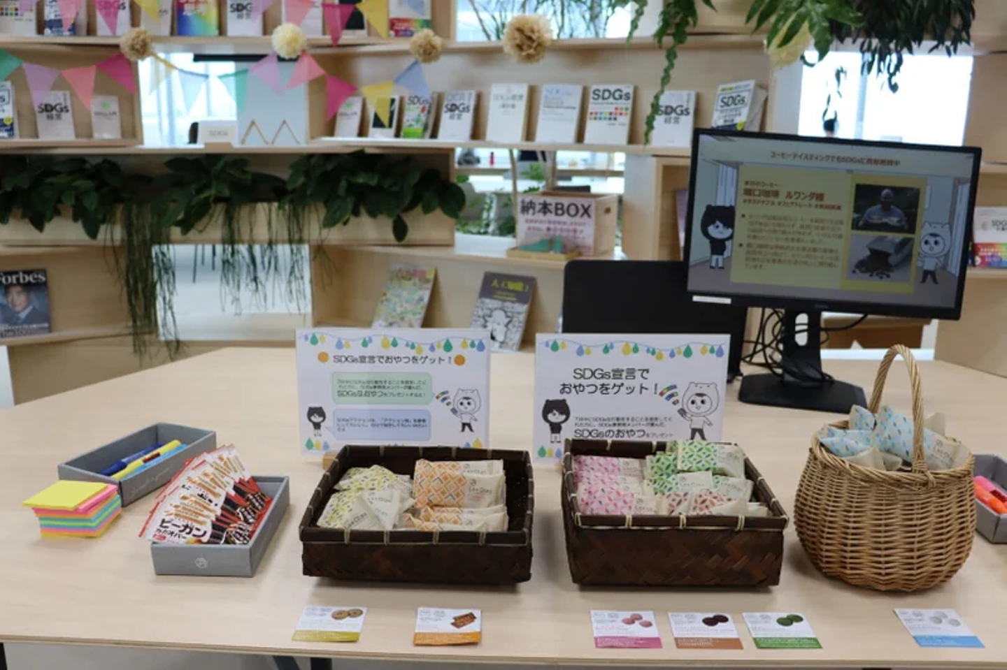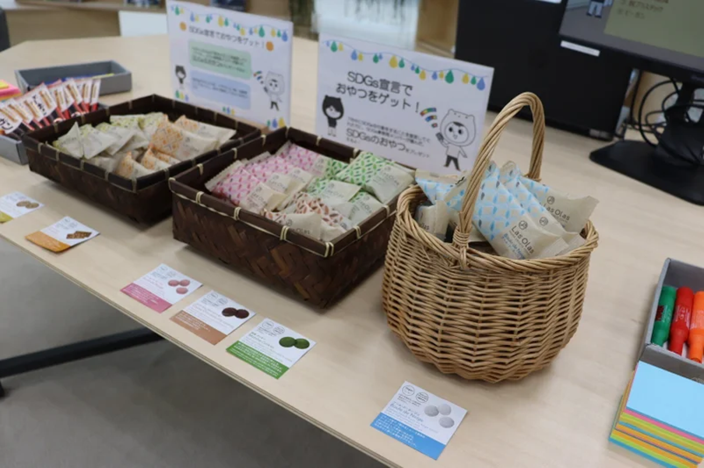 また、SDGsへの理解をさらに促進するために、「SDGs宣言(自分が今日からSDGsのためにどんなアクションをするのか)」を書くとお茶菓子がもらえるという仕掛けに。(ただでは食べさせないぞ!という運営側の策略…。笑)