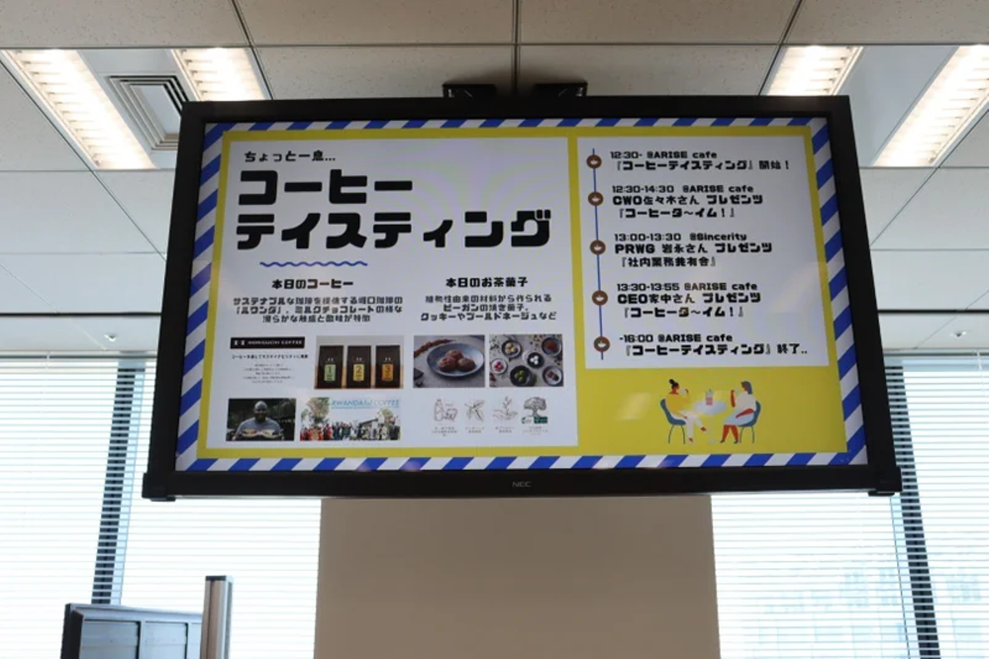 また、今回のCoffee Tastingでは経営層と社員がコーヒーを飲みながら語らうイベントや、社員が行ってきた業務を紹介する「おしごと共有会」も実施。