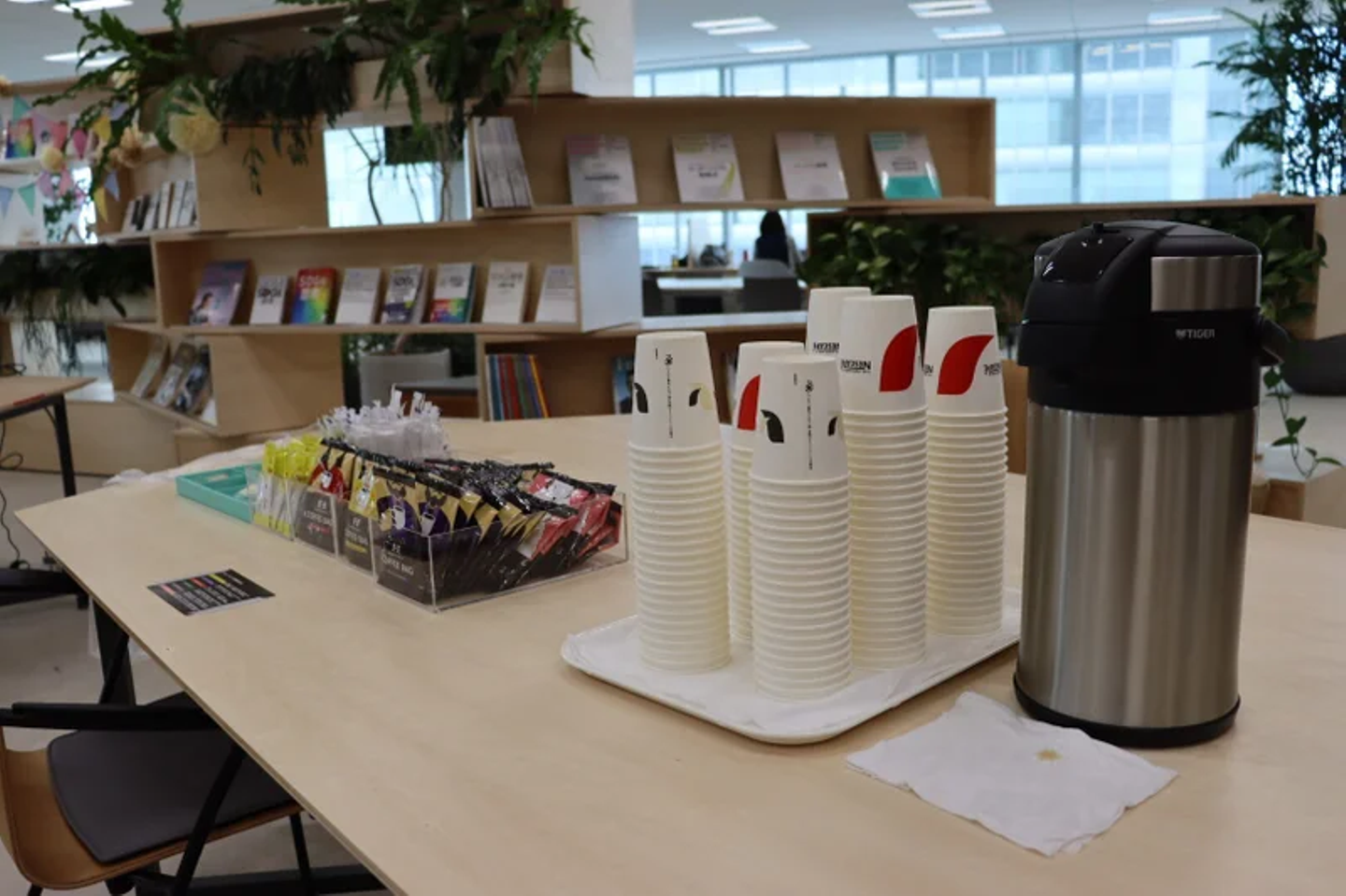当日はヒカリエオフィス内のフリースペース「ARISE caféエリア」にコーヒーとお茶菓子が並びました。ARISE analyticsは昨年からSDGsの取り組みを始めており、そのファーストステップとして社員のSDGsの認知向上に力を入れています。そのため今回のCoffee Tastingでは、SDGsにつながるコーヒーやお茶菓子を選びました。