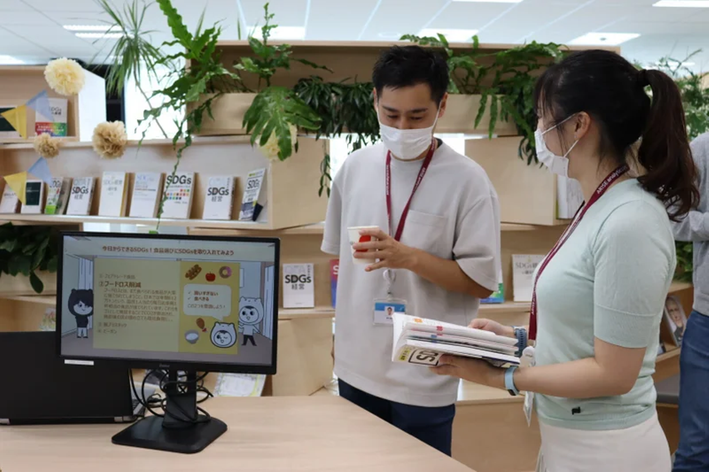 ARISE café に併設するARISE libraryにはSDGsの関連書籍を集積したコーナーがあります。この仕掛けをきっかけに、SDGsの関連書籍を片手に議論する社員もいました。