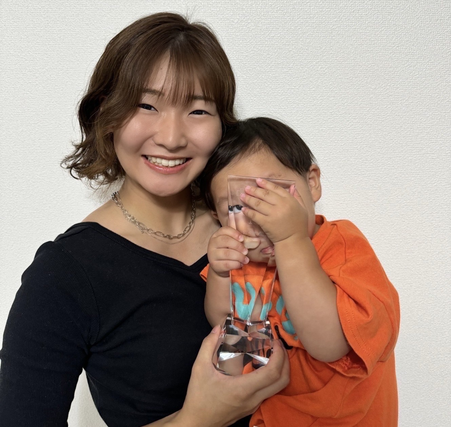 BTM賞のトロフィーを持って、佐々木さんと息子さん♡