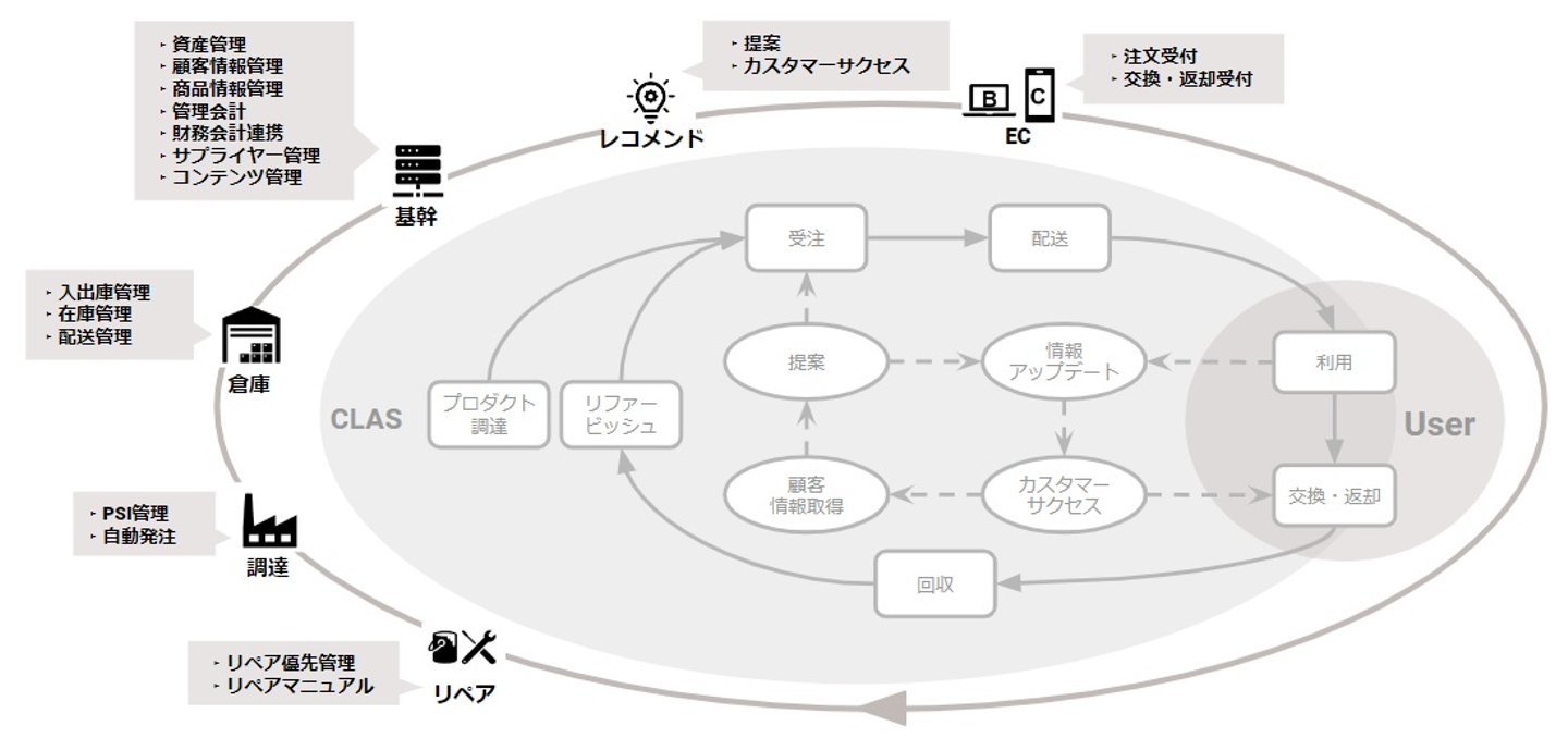 商品企画~配送、リペア・クリーニングまでトータルプランニング!テックカンパニーとして、自社システムを構築することで全情報の一元管理&連携を行い、一気通貫型のサービスを実現しています。 CLASはテックサブスクとして、これを実現できている日本で唯一の企業です!実際に倉庫では、独自の基幹システムによる優れた管理環境や、その中で専属のリペア・クリーニングチームが働いているという、CLASならではの独特な光景が広がっています。