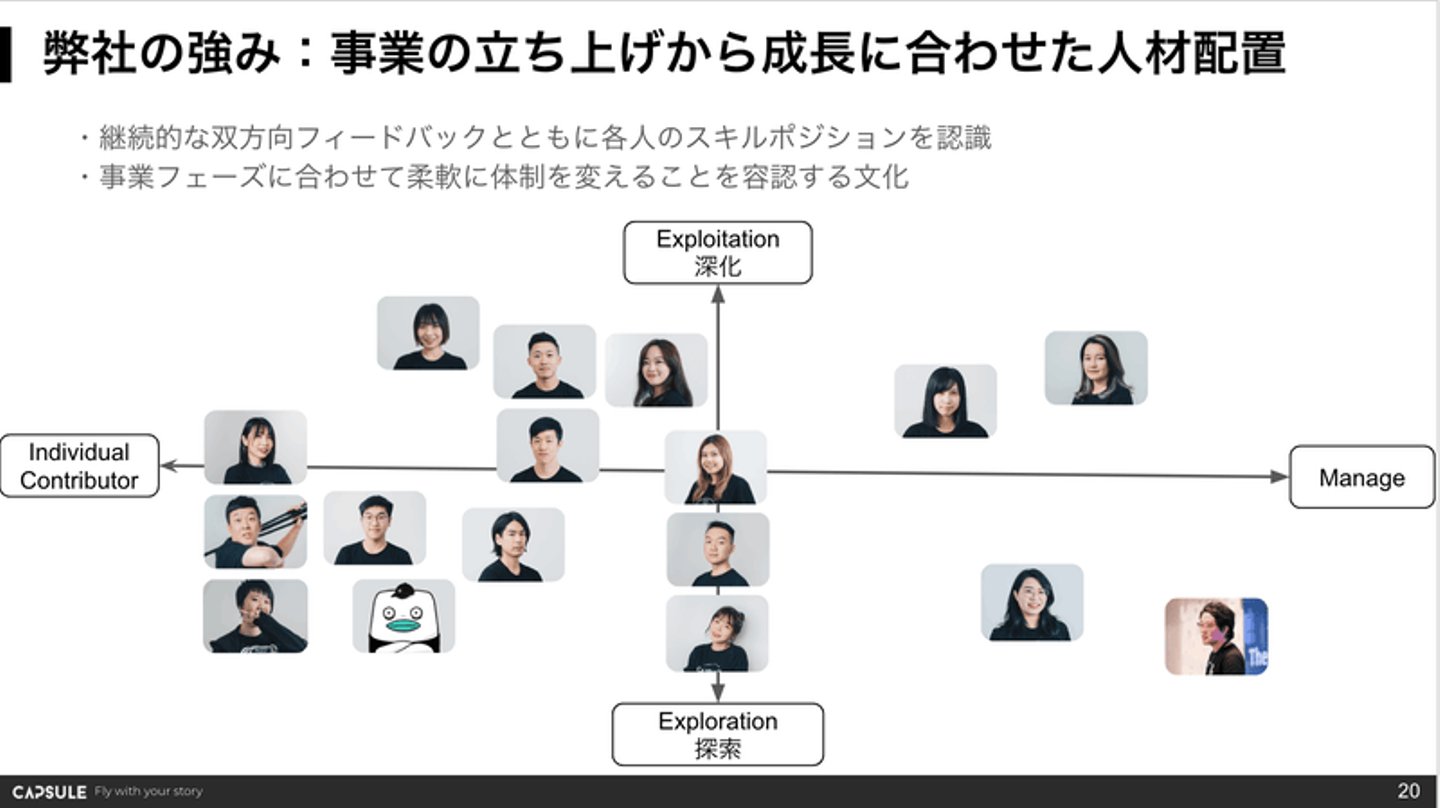 現在は社内でこのようなリーダー陣のマッピング表がある。誰がマネジメント職、誰がプロフェッショナル職(Individual Contributorと社内で表現)、誰が事業フェーズの0→1、10→100を今は担当しているか、を社内で公開している。またこれは現在の役割で比較的頻繁に変わる。