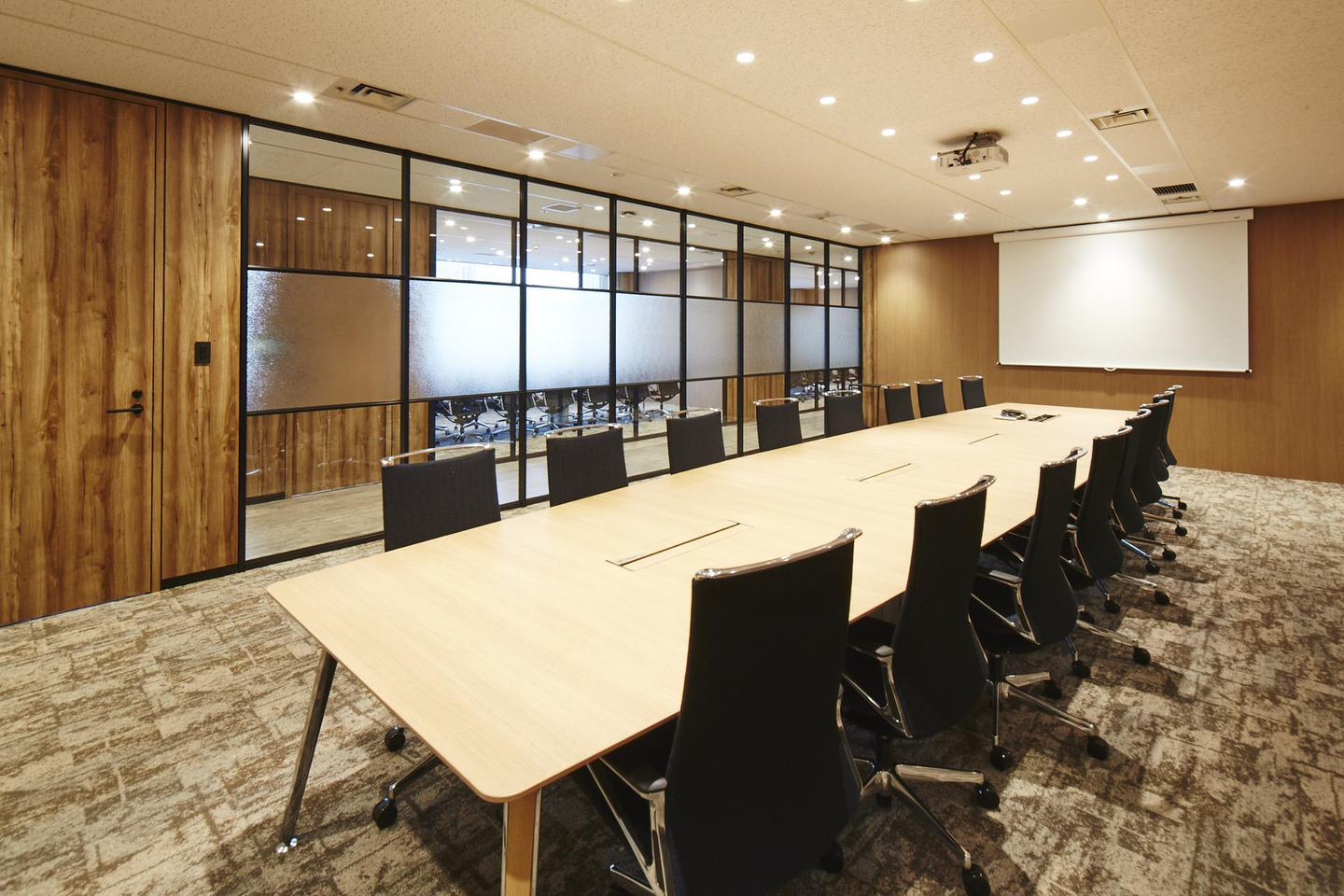 各所に配置されているミーティングスペースとは別に、会議室もございます!なかには40~50名が入るサイズの会議室もあります。各社員が専用端末で予約し、用途に合わせて自由に利用することができます。採用選考を対面で実施させていただく際は、このような会議室で実施しています。