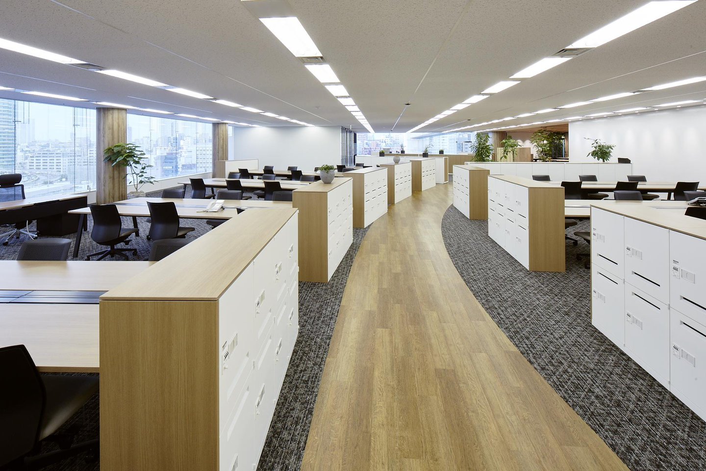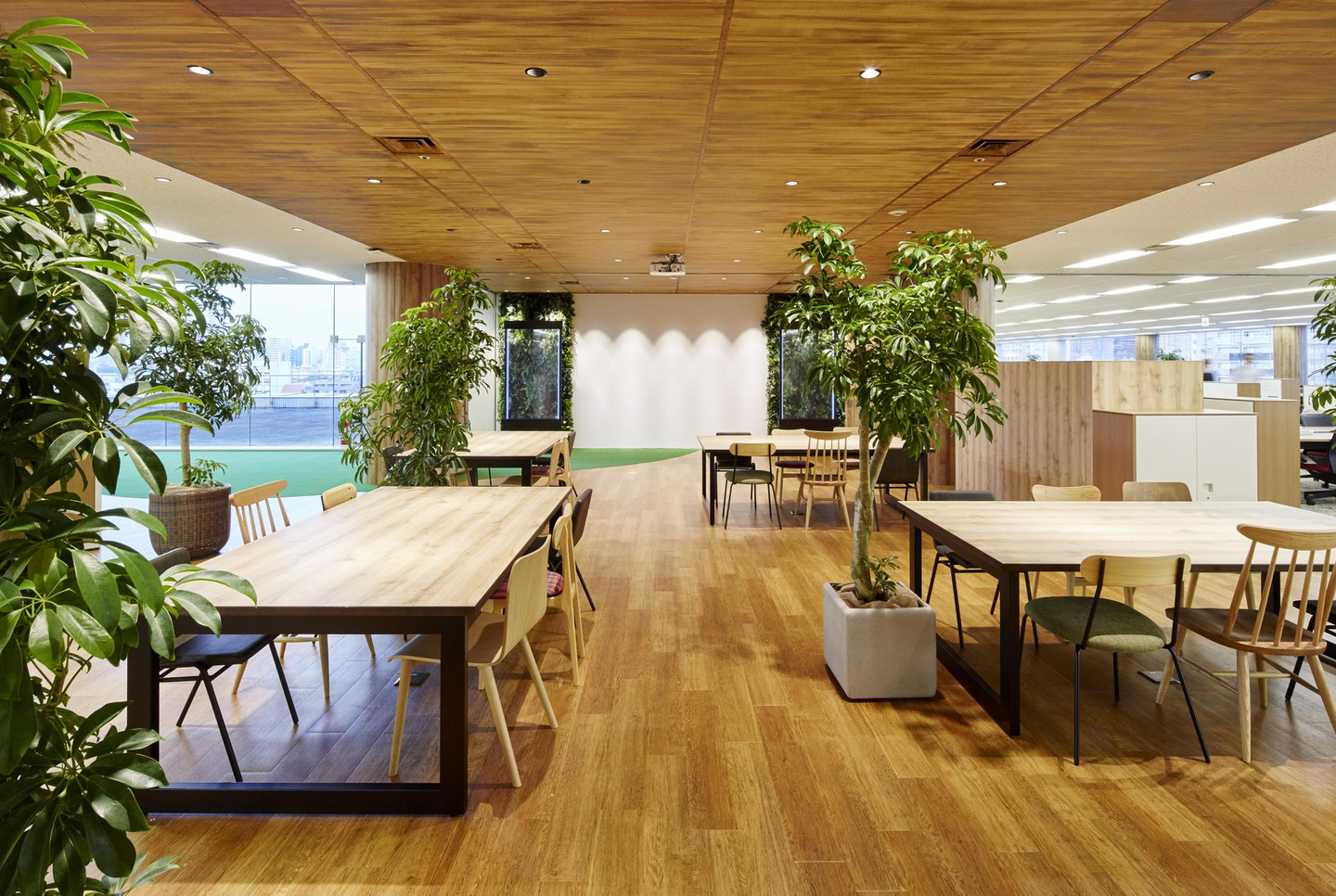 仕切りのない大きな1つのフロア内で、様々な部署の社員が働いています!部署間の垣根を越え、自由で効率的な仕事が行える様、席をフリーアドレスにしています🌸 1フロアの面積は1,300坪あるそうですが、どれくらいの広さか想像しにくいですよね・・・テニスコートを例にすると、なんと16面分相当!!かなり広いため、端から端まで移動すると少し大変です笑🤣