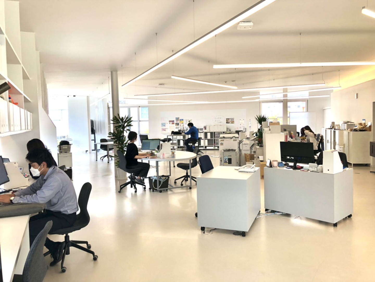 カフェエリア・フリースペースと反対側にあるのが私たちが普段いる事務所スペースです。白を基調としたスタイリッシュな空間が特徴的です。
