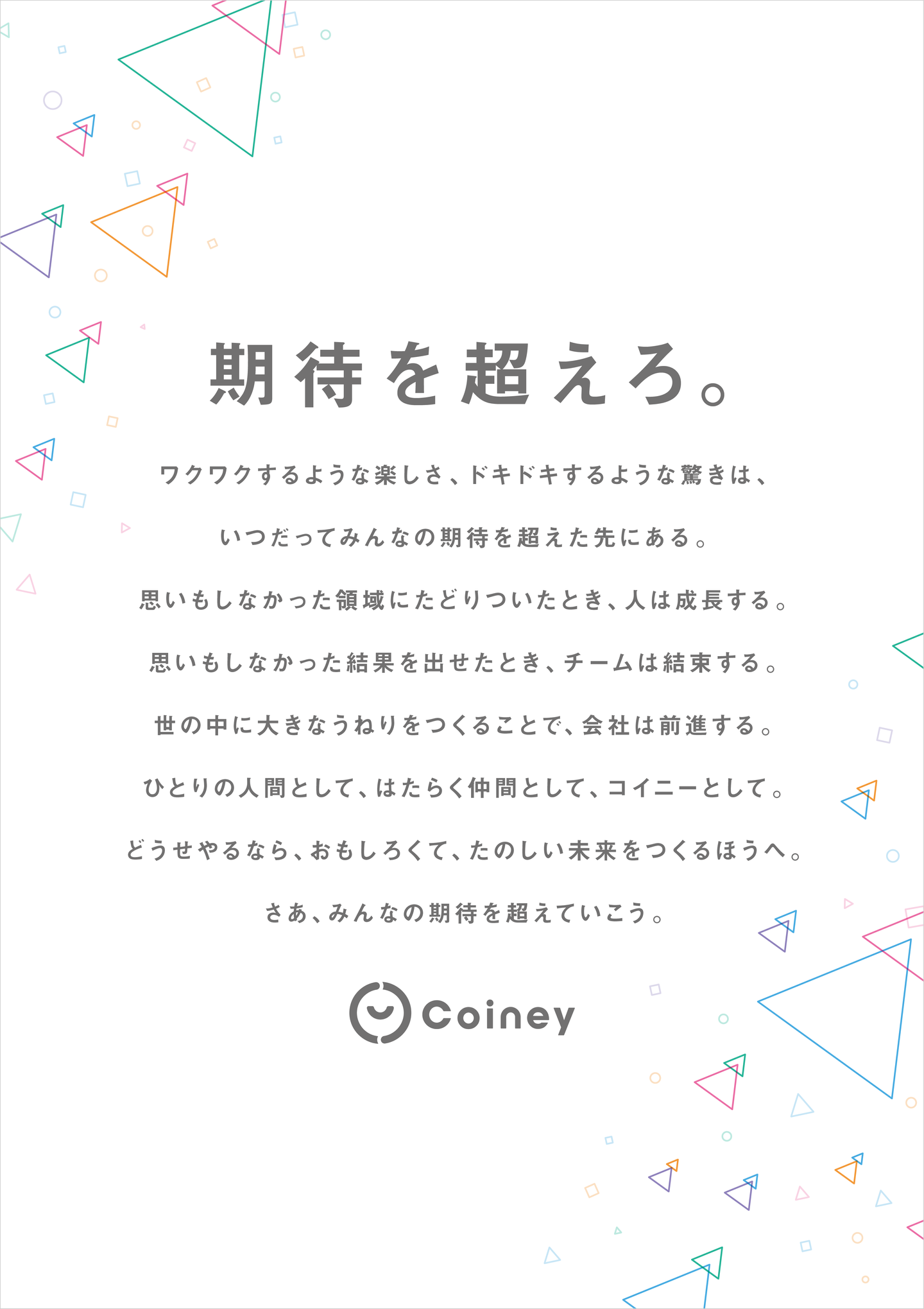 その中で、コイニーが最も大事にしているのは、身の回りにある期待だけでなく、より大きなスケールで期待を超えていくということ。私たちが目指すのは、ひとつひとつの期待を超えることを通して、世の中に大きなうねりをつくり、社会を前進させること。これに尽きます。