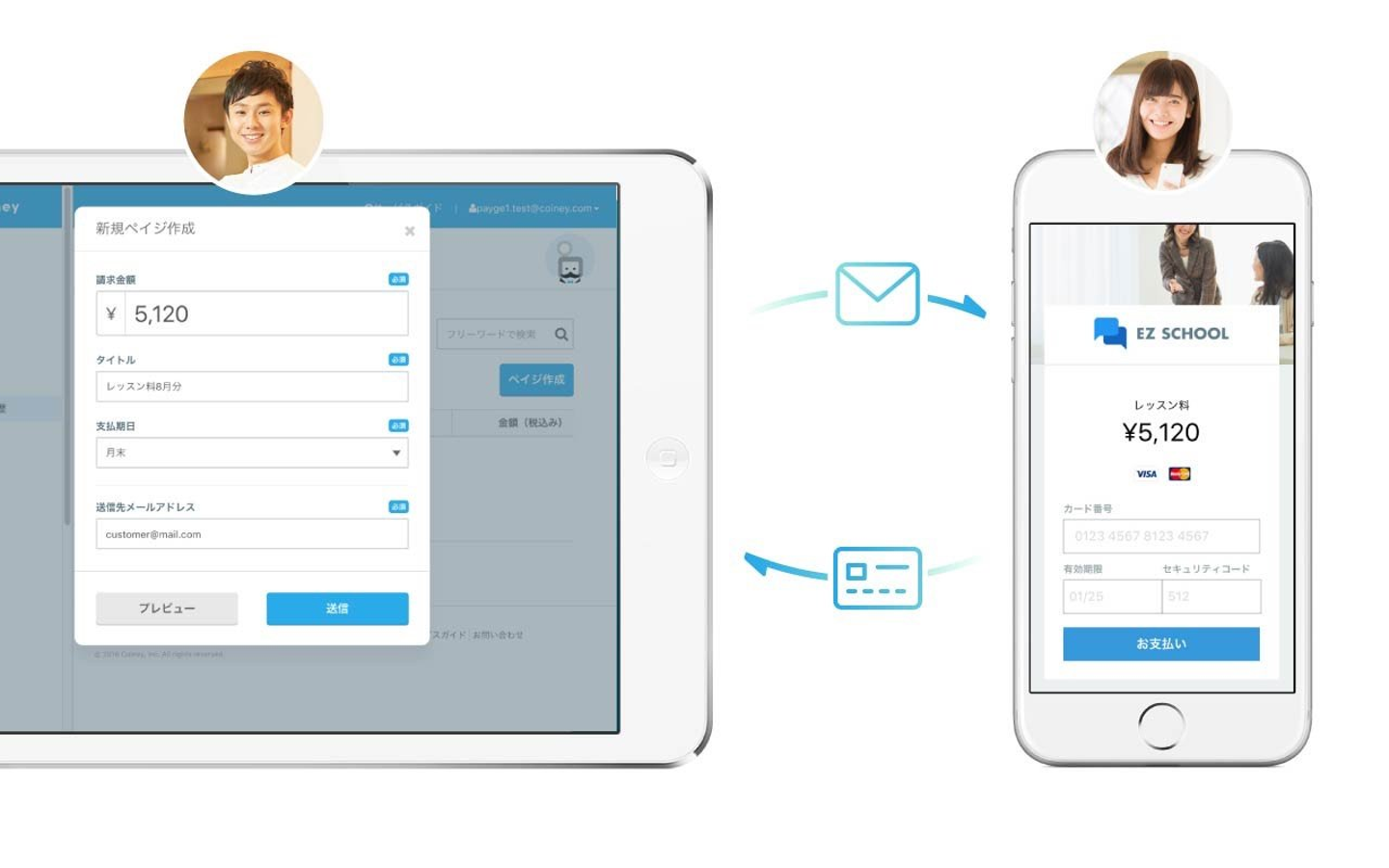コイニーペイジは、決済用のウェブページがかんたんにつくれるサービス。お店のお客様は、送られてきたウェブサイトにカード情報を入力することで支払いができる。お客さまが新規にアプリをインストールなどが必要ない。