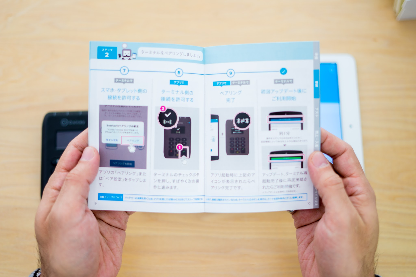 コイニーターミナルのガイドブック。bluetoothという言葉も知らないユーザーの方もいるため誰でも分かりやすいように細かくステップを分けた構成にしている。コイニーの「手間は増えても迷わない方がかんたんである」という哲学に基づいている。