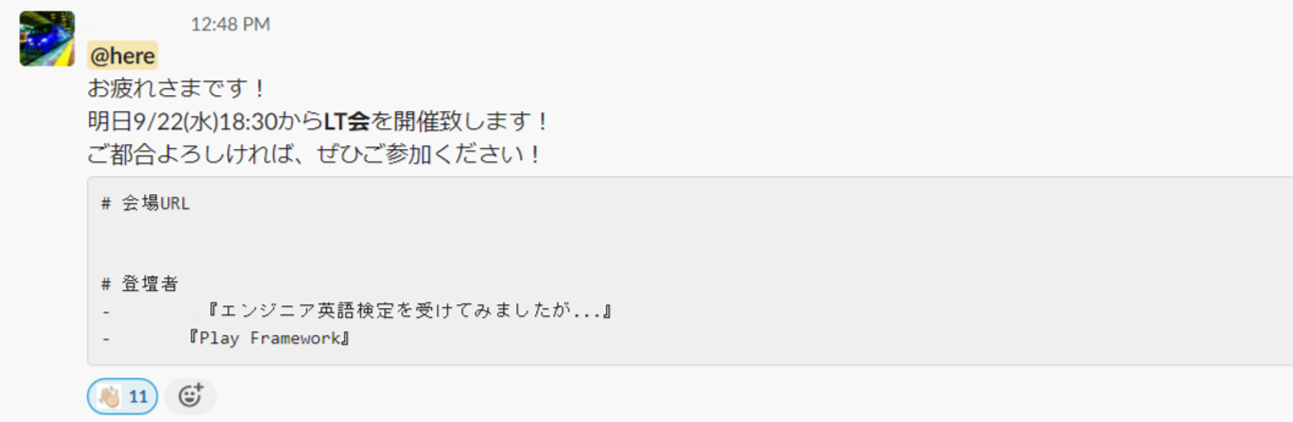 EVERRISEでは月に1回テーマに沿った発表を行うLT会を開催しているのですが、それとは別に、週に1回1人5分の持ち時間で発表できるさくっとLT会も開催しています。