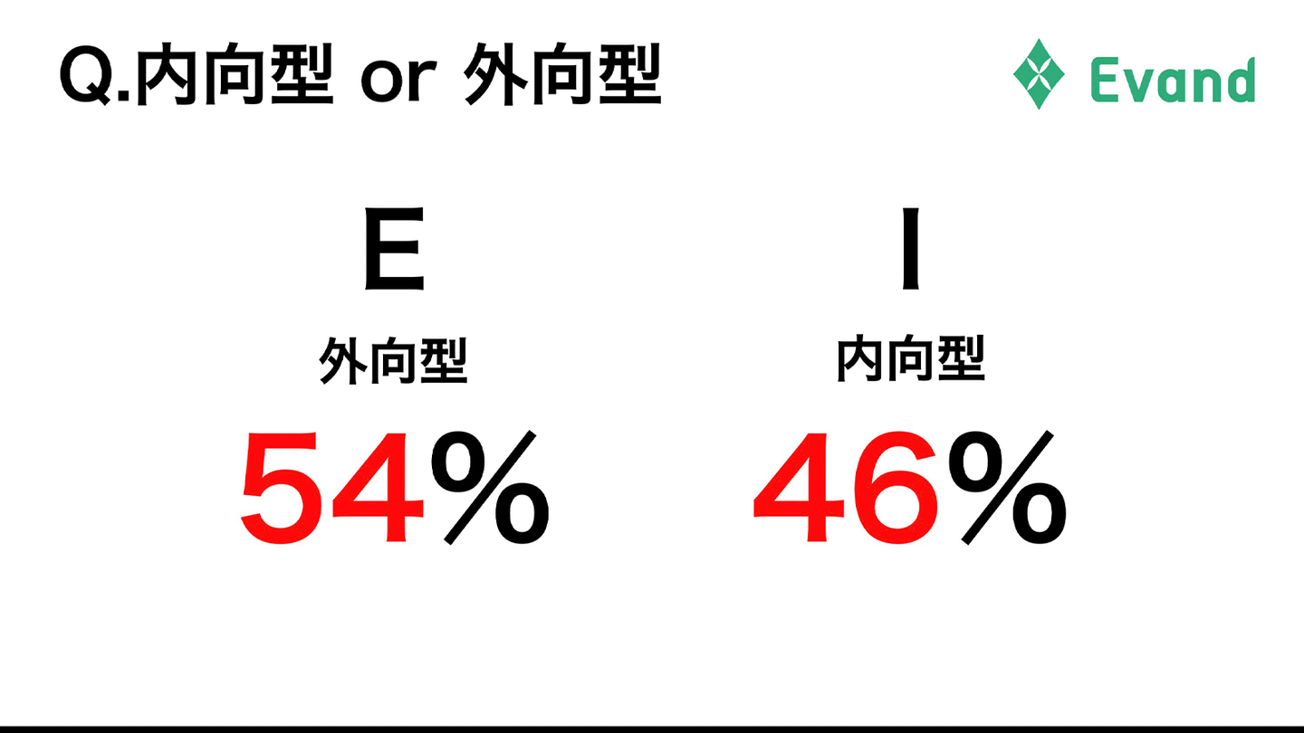 この診断において、最もはっきりと傾向が分かれると言われている「人々のエネルギーの源」ですが、外向型「E」が54%で内向型「I」も46%とほぼ半数近い割合で推移していることが明らかになりました!