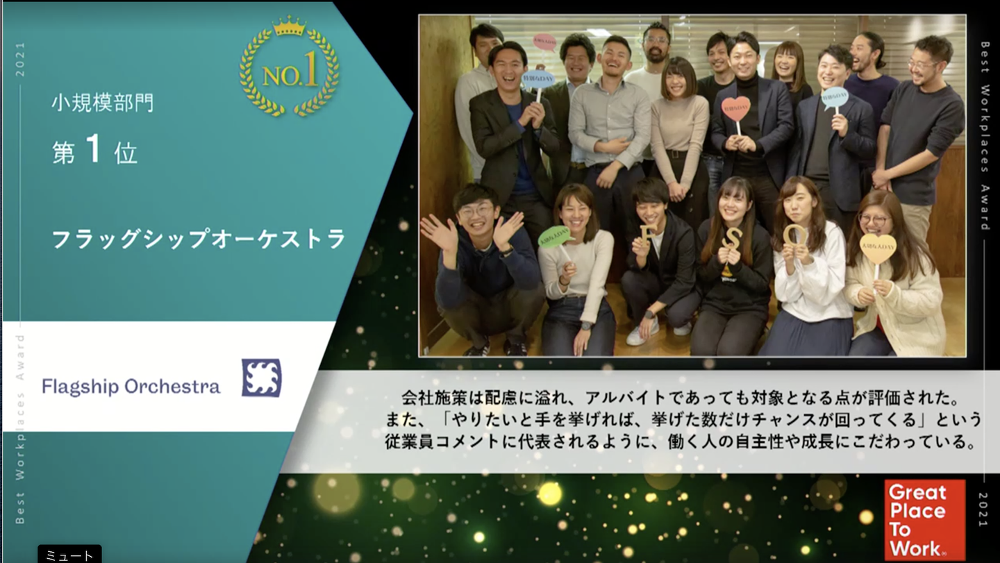 こんにちは! フラッグシップオーケストラ(通称:FSO)の採用広報担当、七澤です! 先日、「働きがいのある会社」ランキングにてベストカンパニーを受賞し、表彰式に参加してきました! 「働きがいのある会社」ランキングとは世界約60カ国で展開している世界最大級の意識調査機関Great Place to Workが、企業向けアンケート・従業員向けアンケートをもとに選出するランキングです。 Great