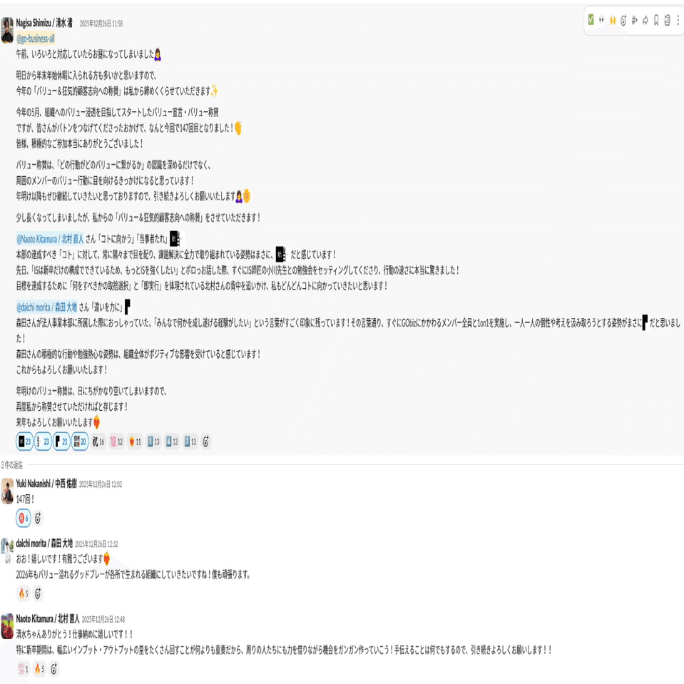 清水:バトンをつなぐこと自体は変わらないのですが、毎朝Slackでバリューを体現する行動ができているメンバーを取り上げて投稿し、賞賛する取り組みです。