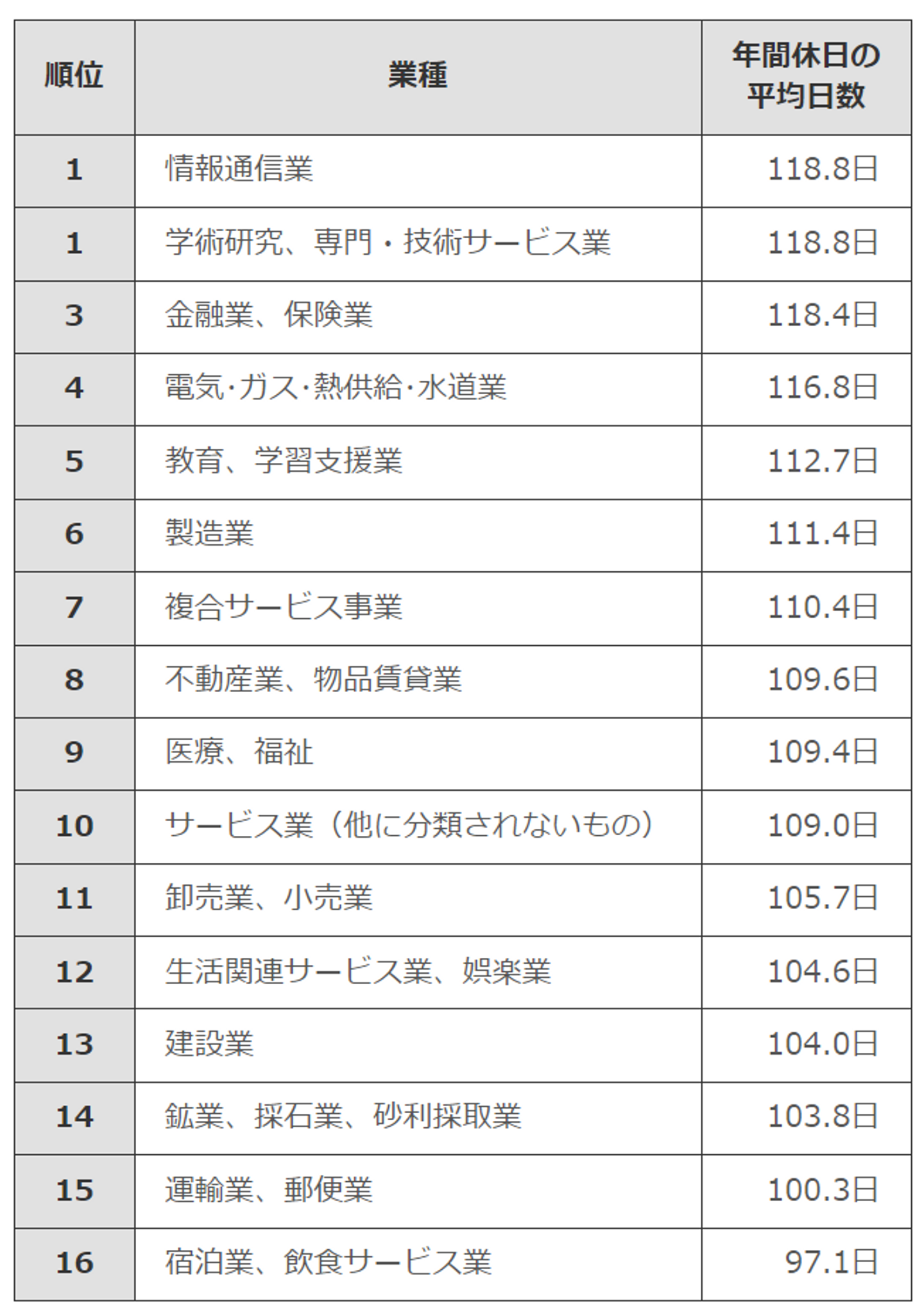 上記の表は業種ごとにまとめた年間休日の平均日数です。