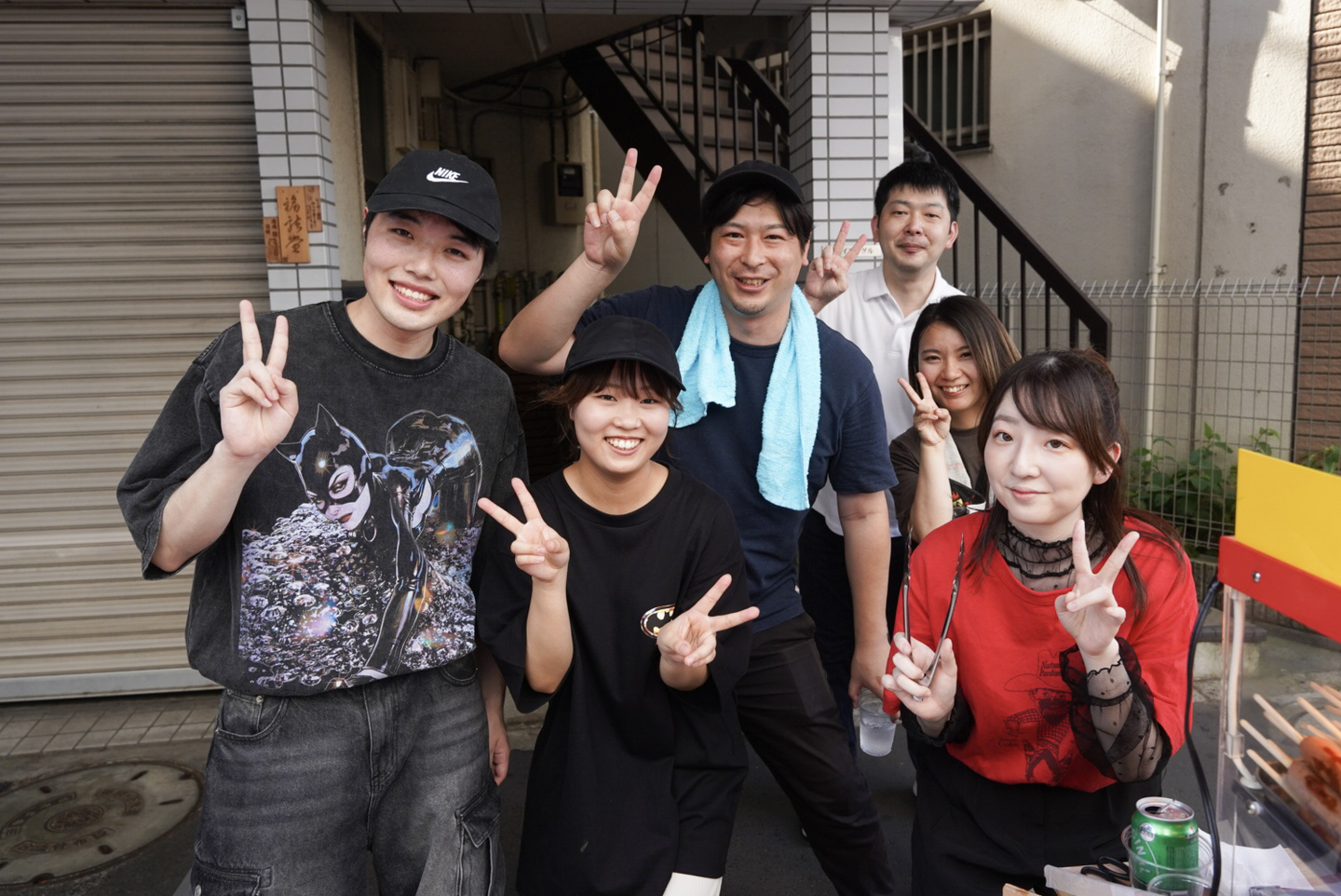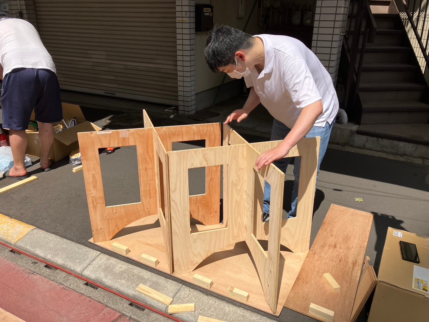 早速、ここからお祭り2日間の様子を見ていきましょう!まず初日は屋台の設営からスタート!設営には力と経験が必要となるためお祭り出店の初期から参加している社員が中心に準備をしてくれました。