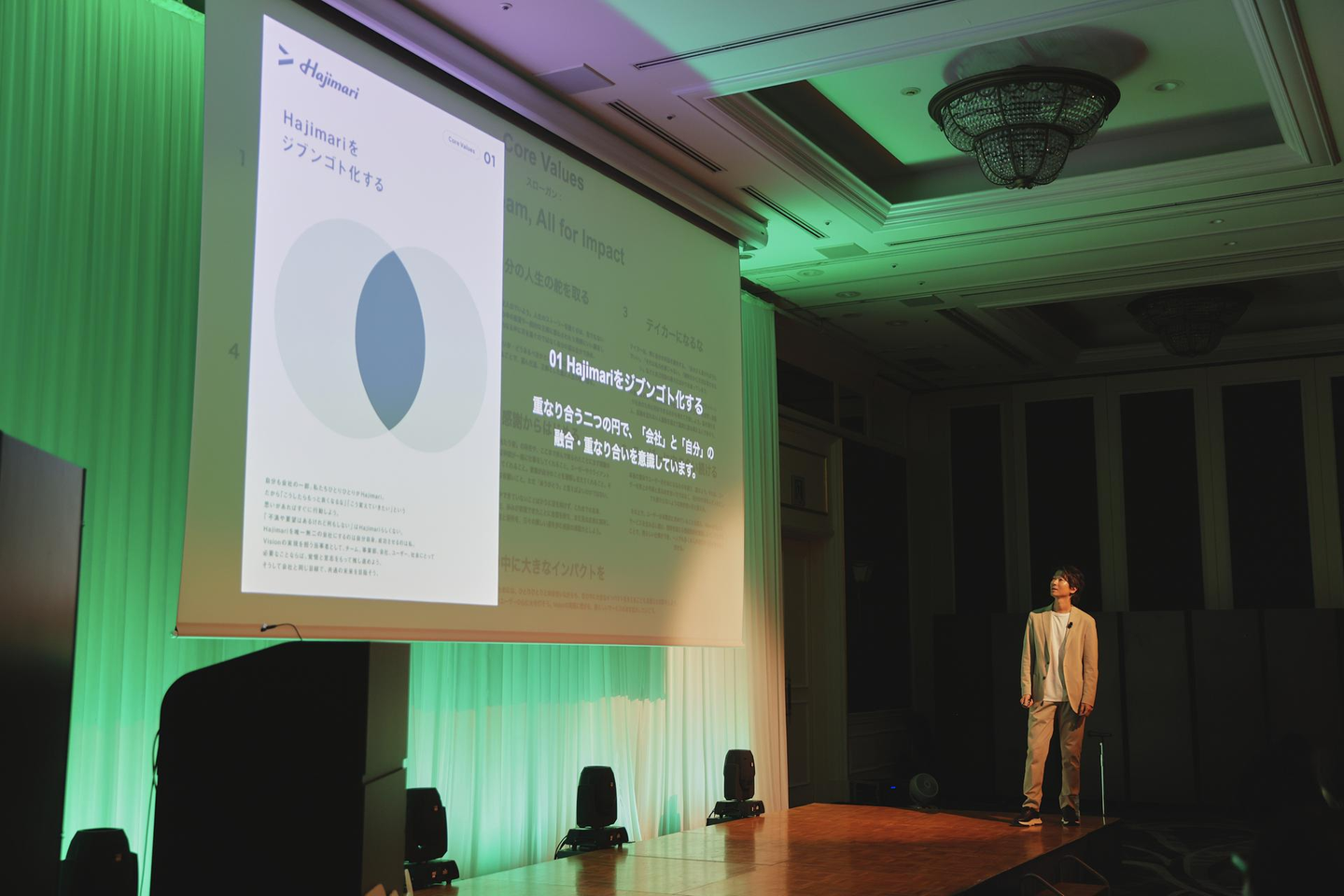 第2部のはじめは、Hajimariの代表木村が社員に直接想いを伝えるプレゼンテーションです。2025年度上半期の振り返りや、今年度の方針などが語られました。