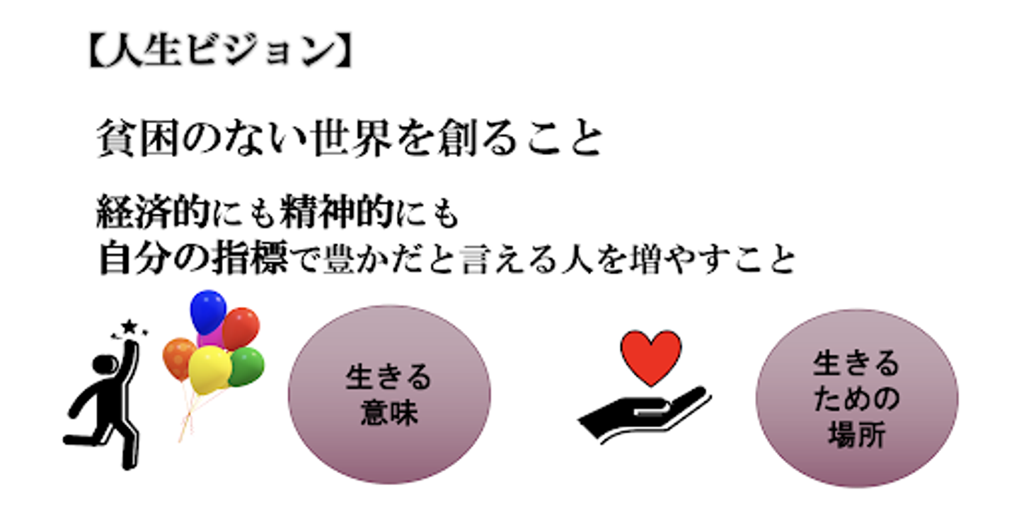 そのために生きる意味、生きるための場所(お金を稼ぐ場所など)をもった人を増やします。私のビジョンを実現するために、人生100年時代と言われる中で働く時間が50年を占めるということから、働く意味と自分の自己実現に効果的な場で働く人を増やしていこうと決めました。