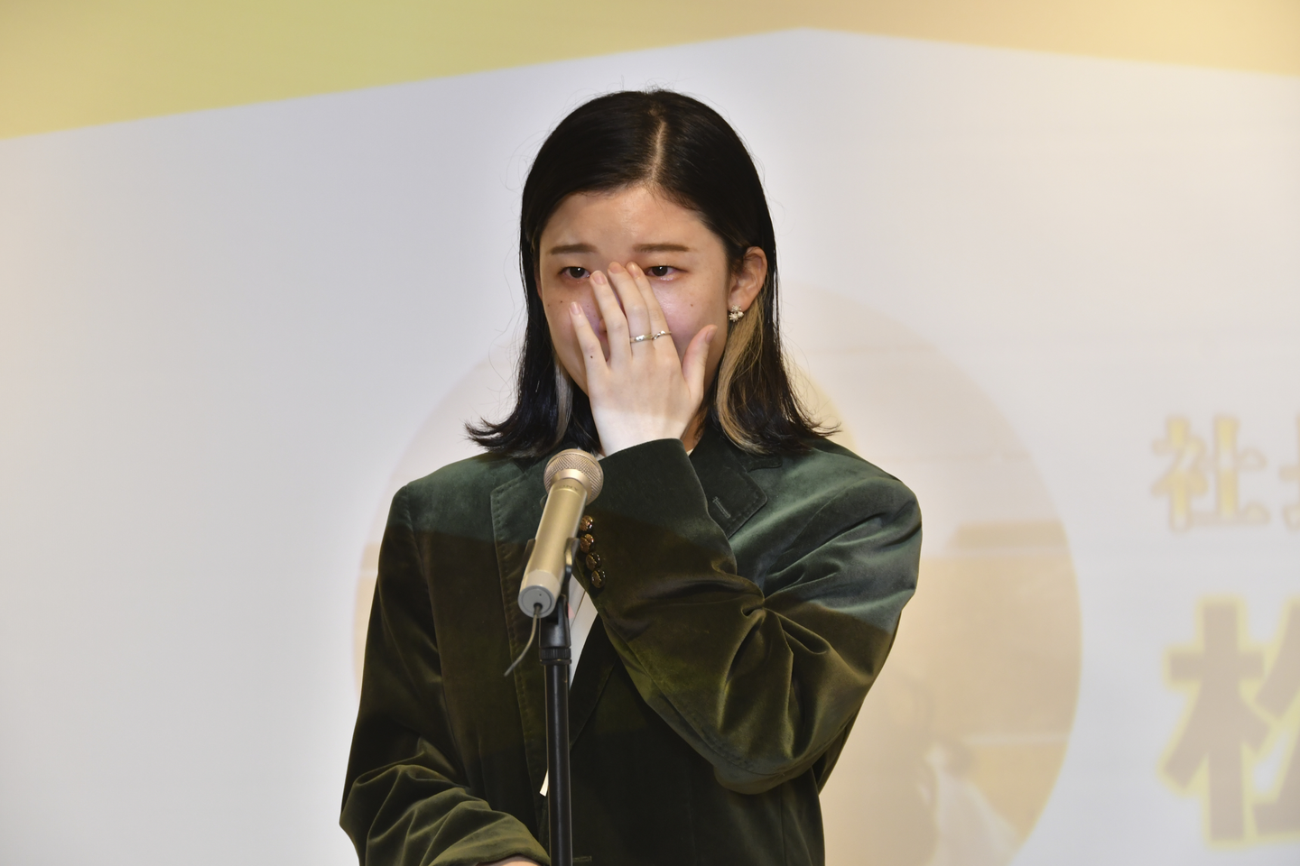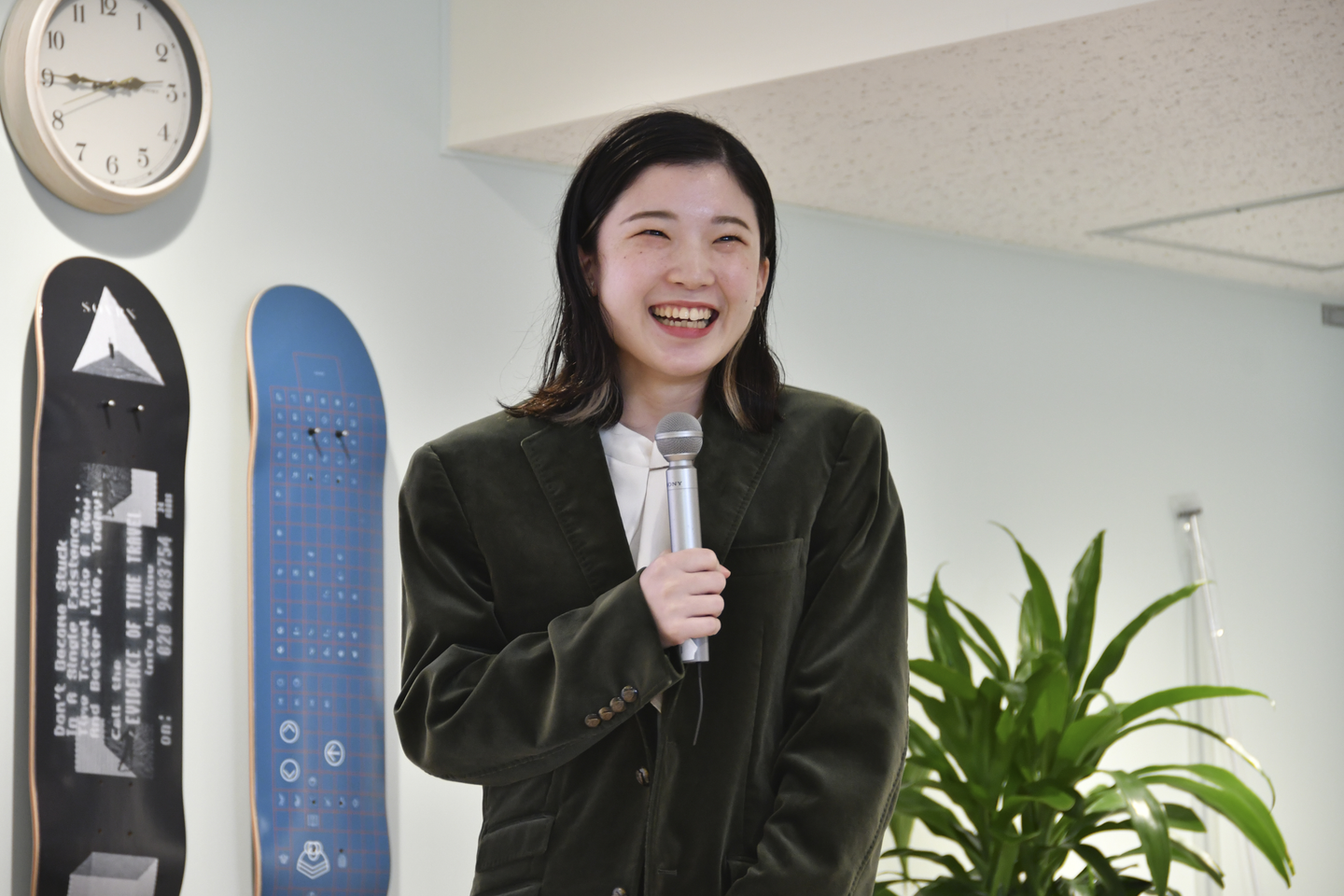 22卒内定者ながら、社員も尊敬するほどの、妥協のない仕事ぶりが評価され、社長賞を受賞した松本さん。 確固たる情熱や信念を持って来春より入社してくる彼女を、事業部メンバーだけでなく社員全員が讃えました。
