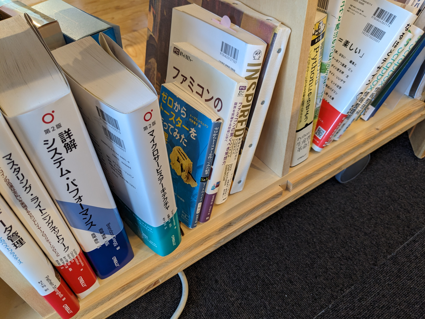 オフィスには大きな本棚があります。O'Reillyの本たちに混ざって、僕が持ってきた本「ゼロからトースターを作ってみた結果」もこっそり置いてあります。