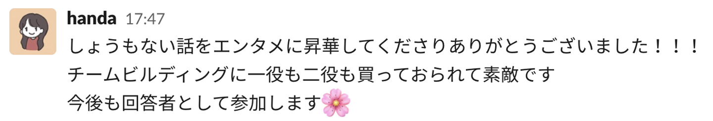 勢いで始めたクイズに「チームビルディングに役立っている」と評価してくれた