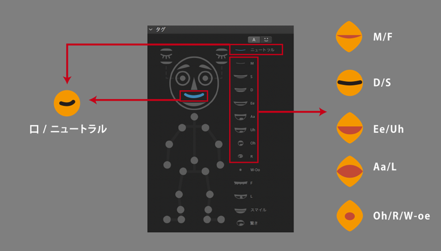 ベースとなる口レイヤーに、口とニュートラルタグを設定することで何もしない時の口、そのほか用意されている11種類のタグに合わせて、口の形を作って設定することで、リップシンクに対応、音に合わせて自然に喋っているように口が動いてくれます。