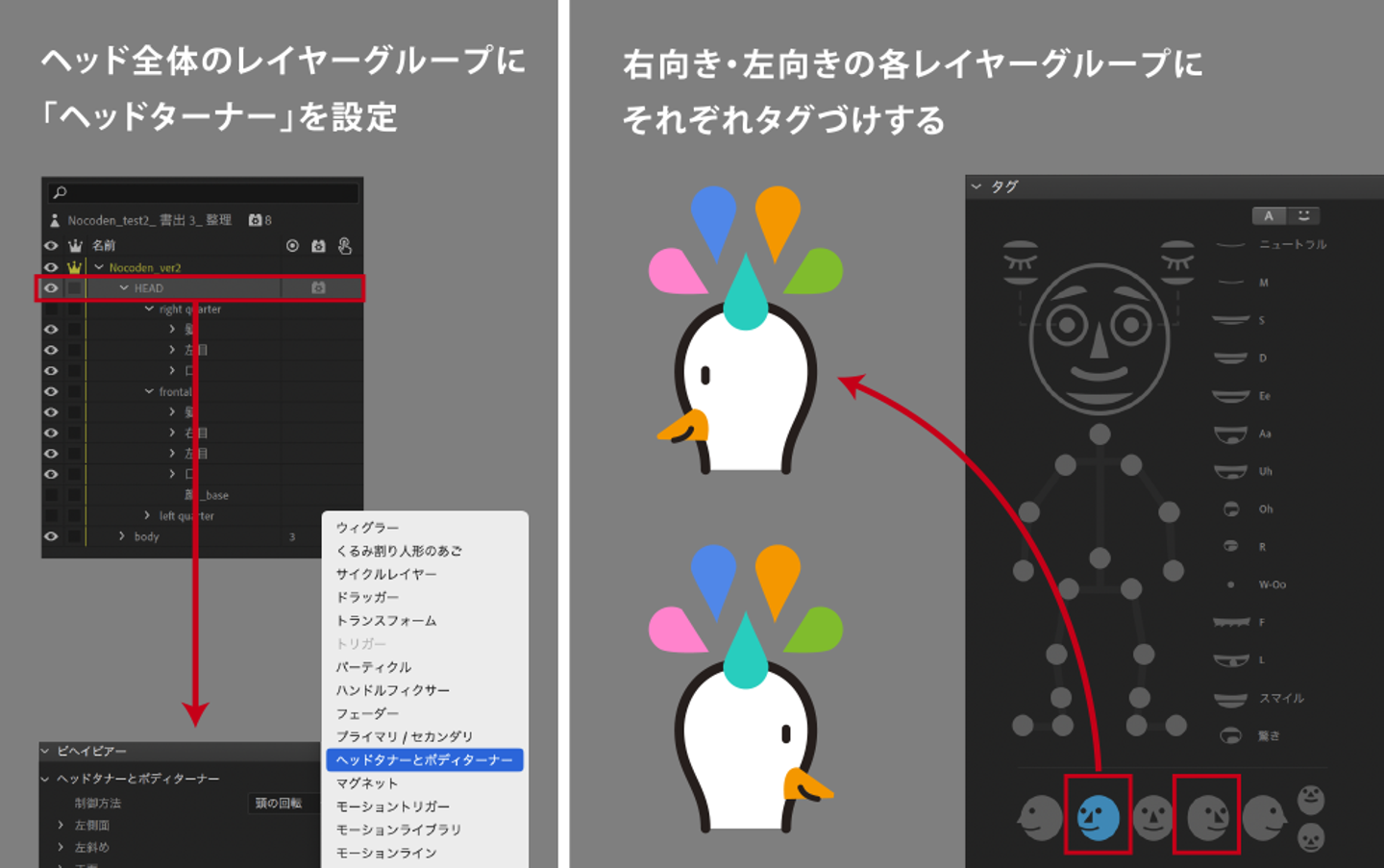 ヘッドターナーという設定を頭全体のレイヤーに設定したうえで、右向きの顔レイヤーグループ、左向きの顔レイヤーグループにそれぞれの向きのタグを設定します。