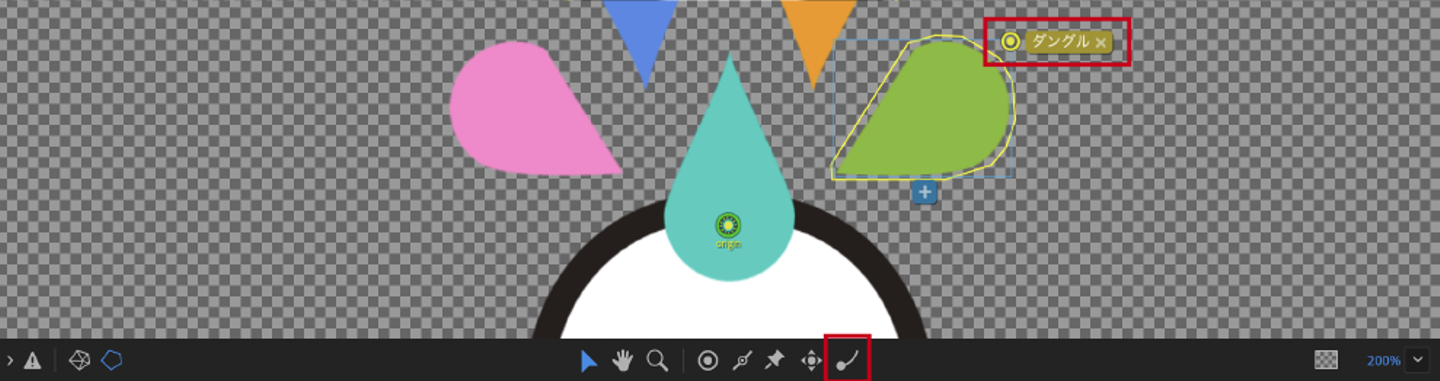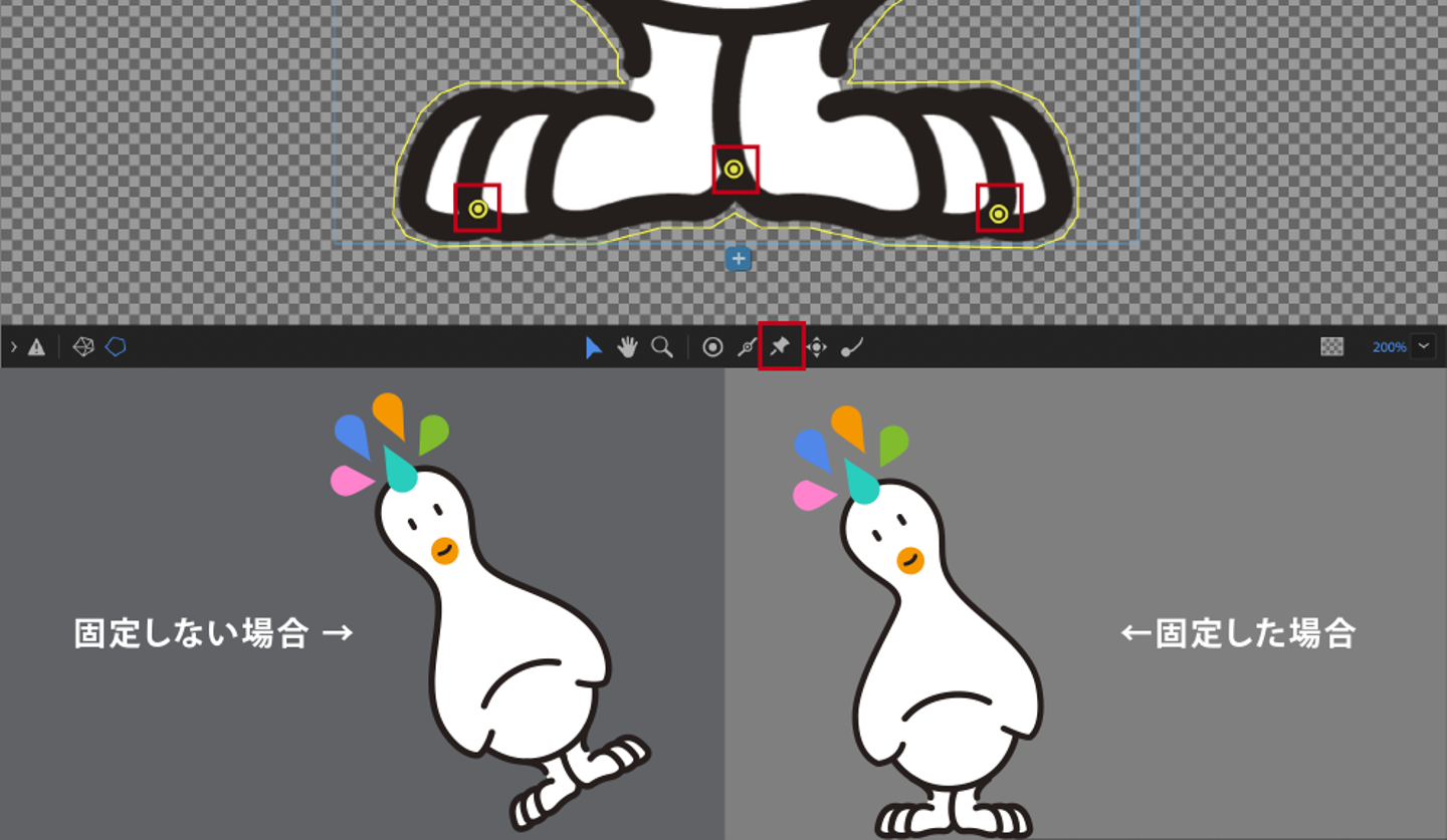 ピンツールを刺すと、刺された箇所は動かなくなり、ピンを刺した箇所が軸となってパーツが動くようになります。言葉ではわかりづらいの画像みたいな違いです。