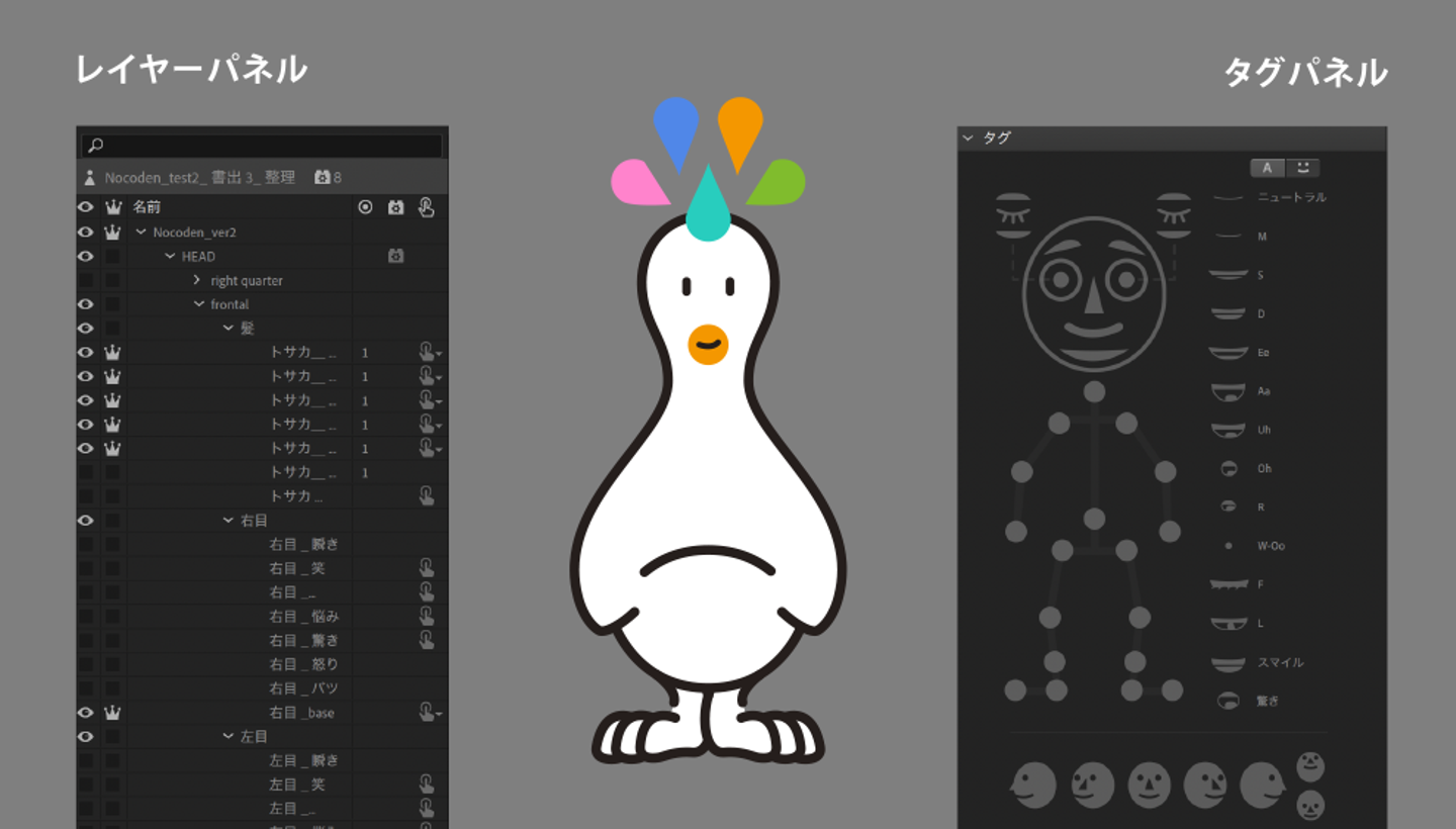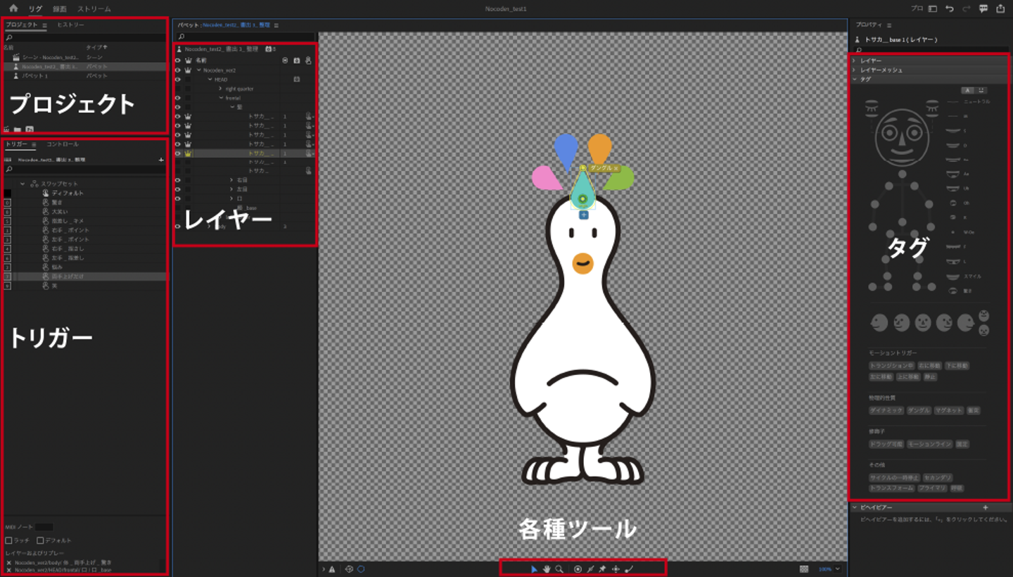 レイヤーを選択し、右側のタグのガイコツみたいなヤツから、口なら口、右目なら右目をクリックするだけです。このタグづけをすることで、WEBカメラに映る人物の顔のパーツと連動して各パーツを動かすことができるようになります。