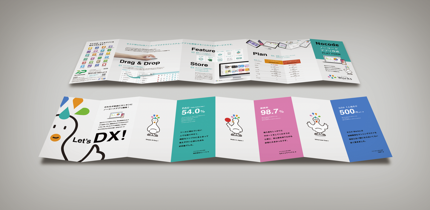 ジャバラ折のA4-1/3想定。片面をキャラ使ってポイントをシンプルに訴求。片面で具体的な内容を訴求。 みたいにしたら結構見やすいかも!!