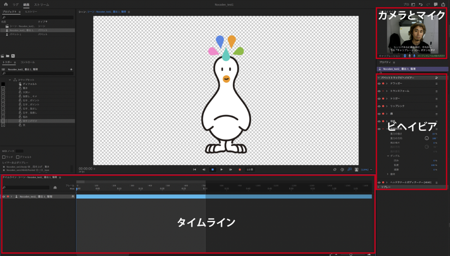 タイムラインにプロジェクトからパペットをドラッグ&ドロップします。設定ができていればそれだけで、もう右上のカメラとマイクに連動してパペットが動いてくれます。最初は結構 感動しますよ!